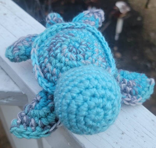 Teal grey and white plush yarn turtle with sparkly silver safety eyes