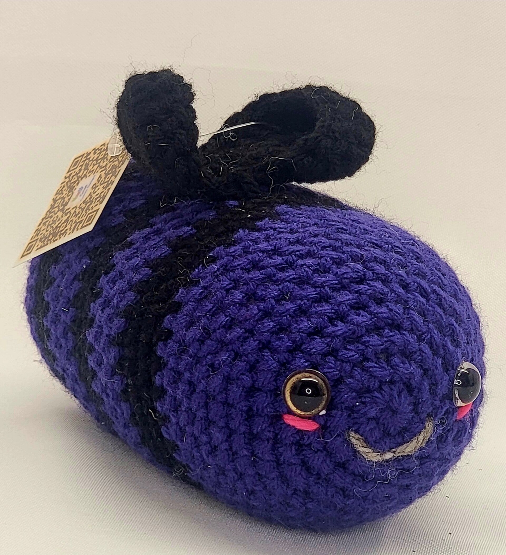 Purple Bee with Black stripes and Black wings. Gold sparkly eyes and a smile! 7.5" long
