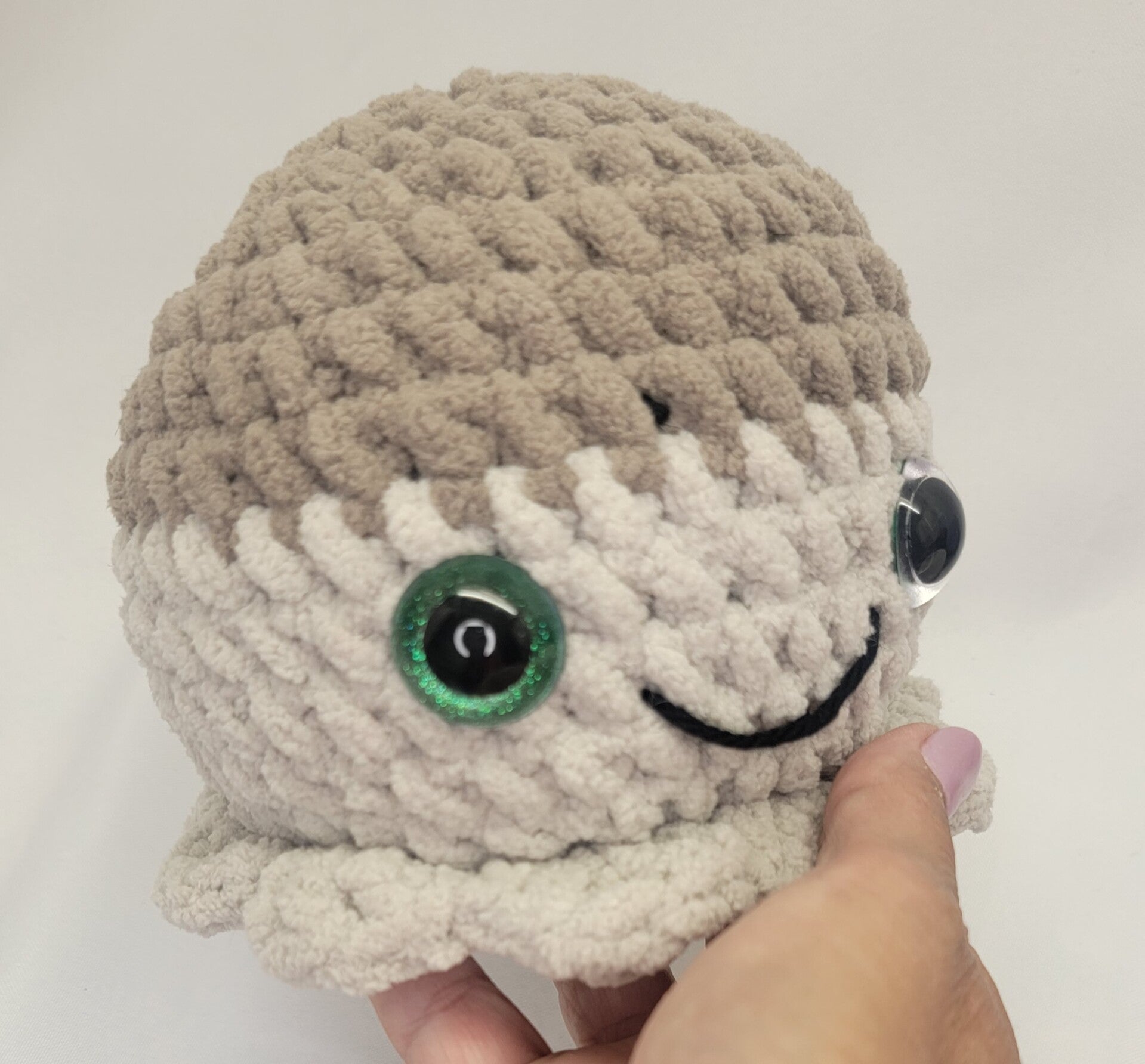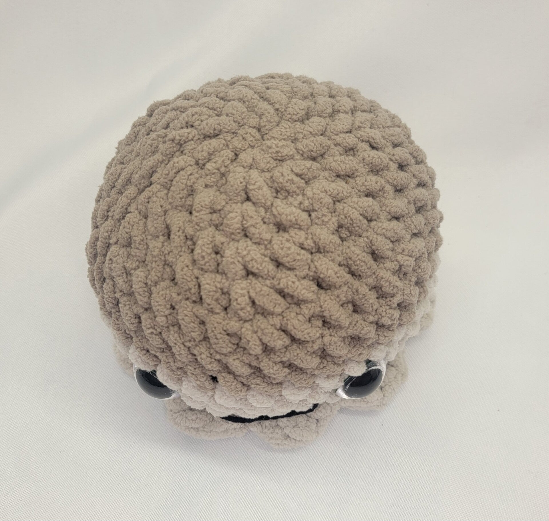 Bulky yarn in Beige and Tan with Tan tentacles. Green sparkly eyes and a smile! 5" tall and 17" diameter.