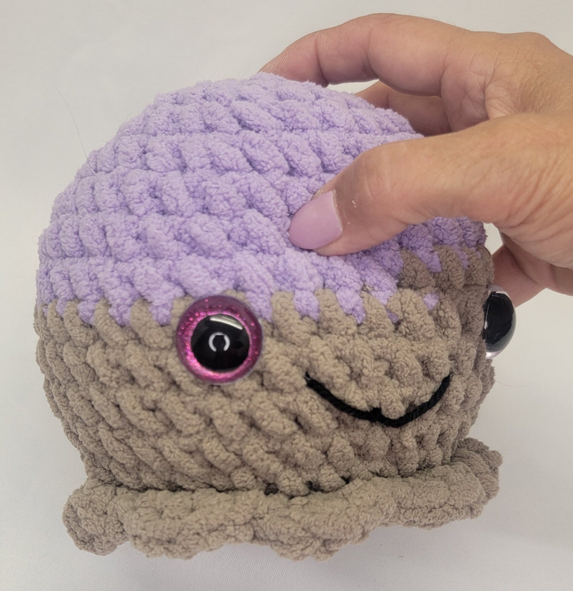 Lilac and Tan octopus with Tan tentacles. Purple sparkly eyes with a smile! 5.5" tall and 17" diameter