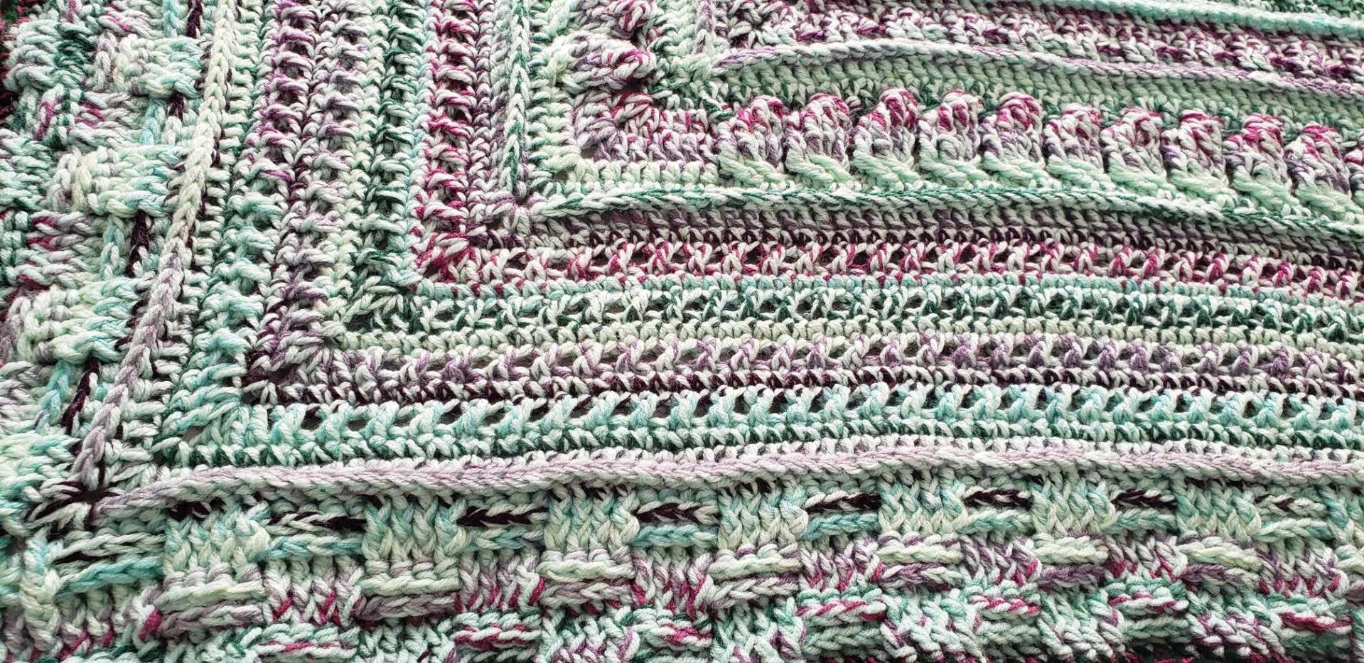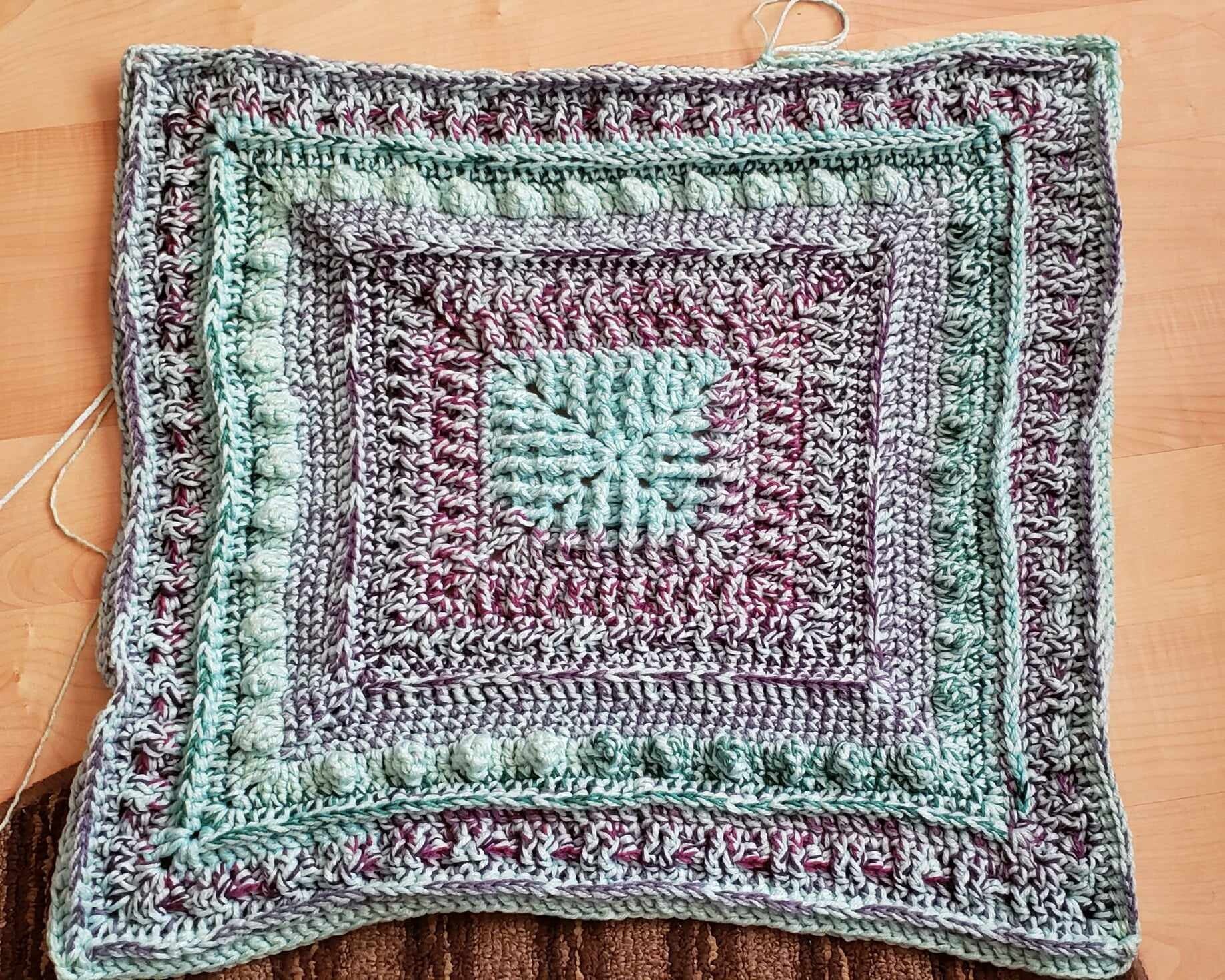 Mint Green and Plum crocheted blanket. 55" x 55" tight stitched Afghan. Beautiful scalloped trim.