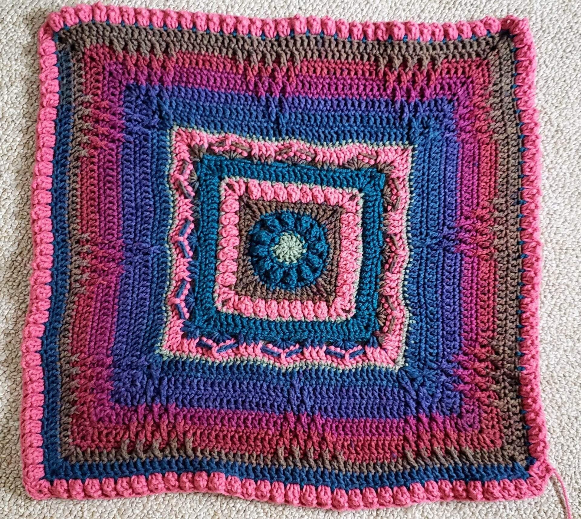 55" x 55" Afghan in shades of Rose, Brown, Blues and Pinks. Many different types of stitches used