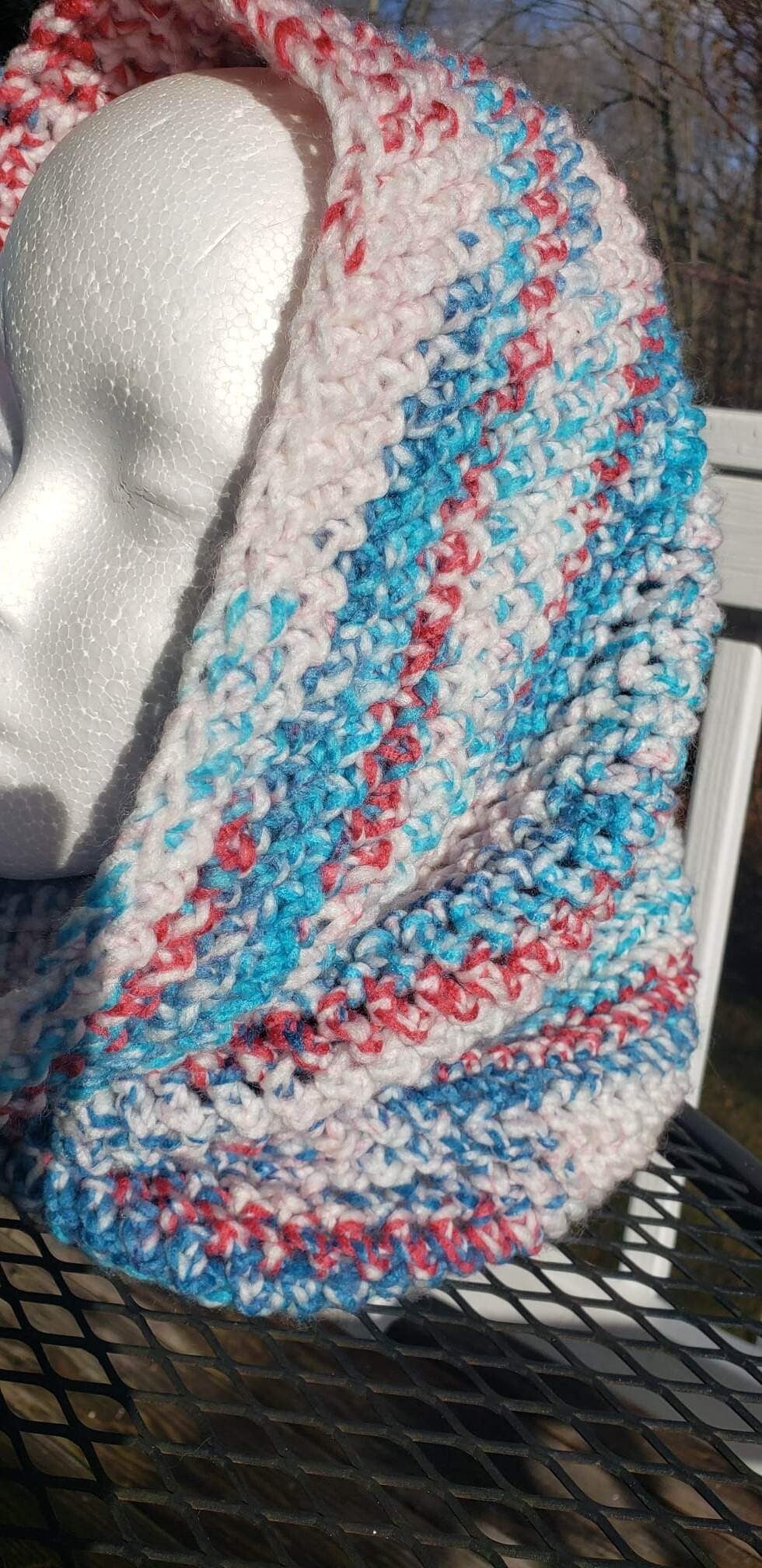 Shades of Teal, White and Coral in this beautiful and soft cowl.