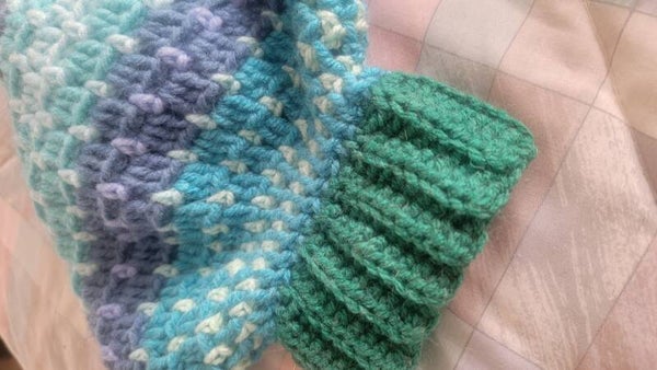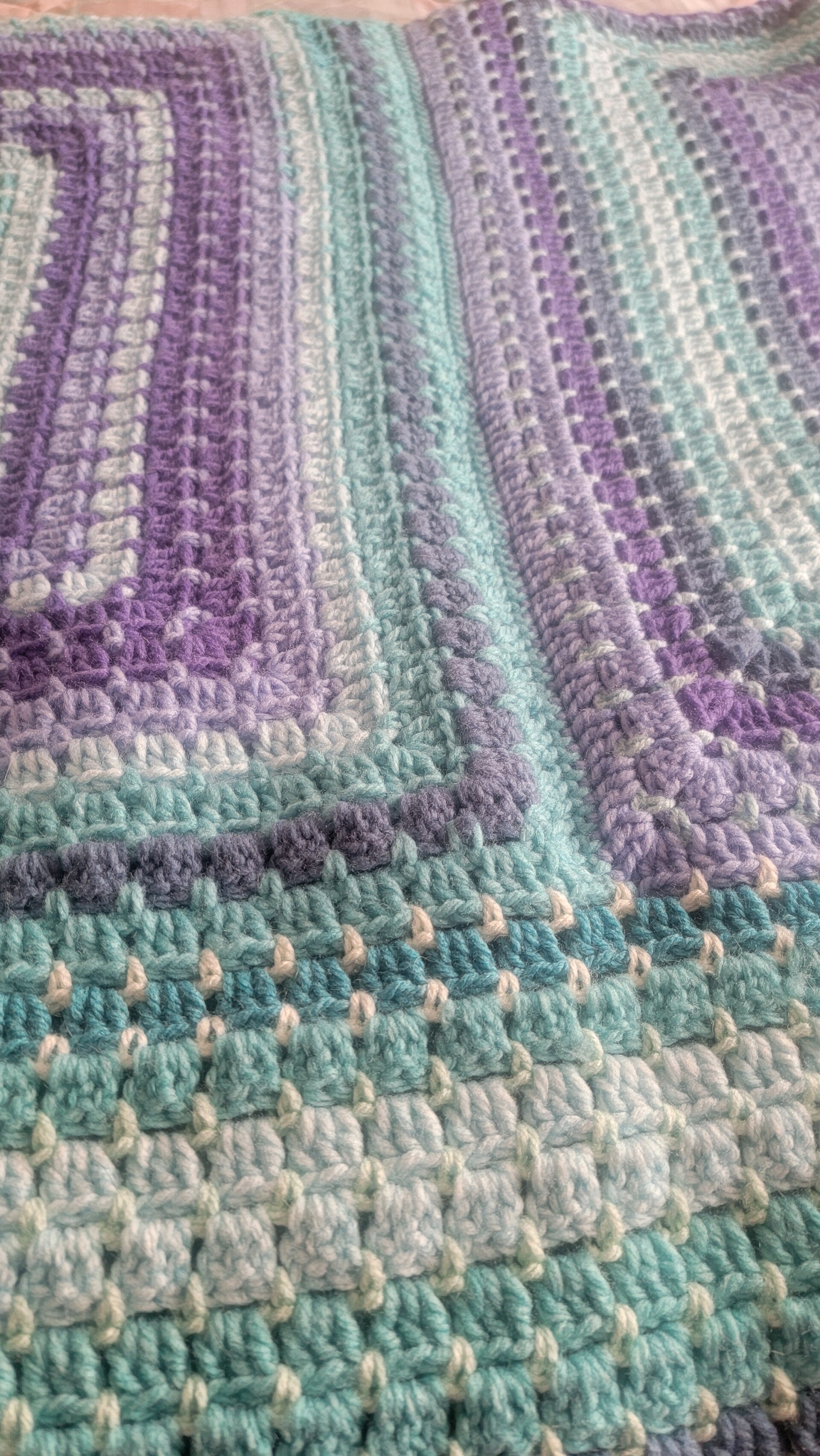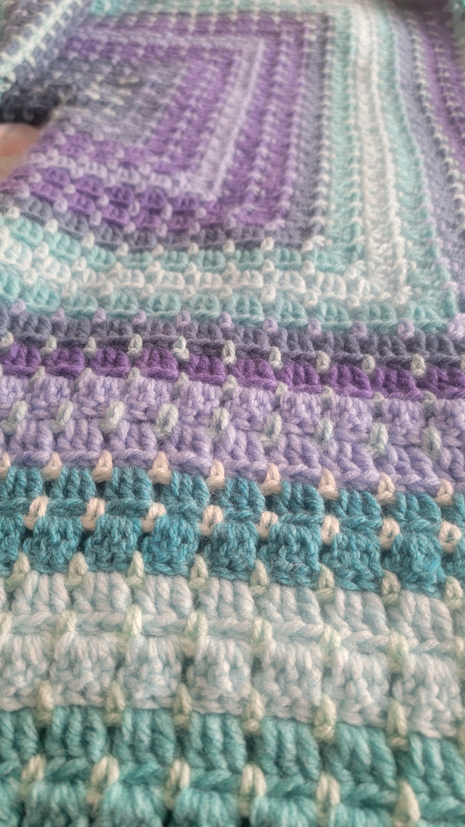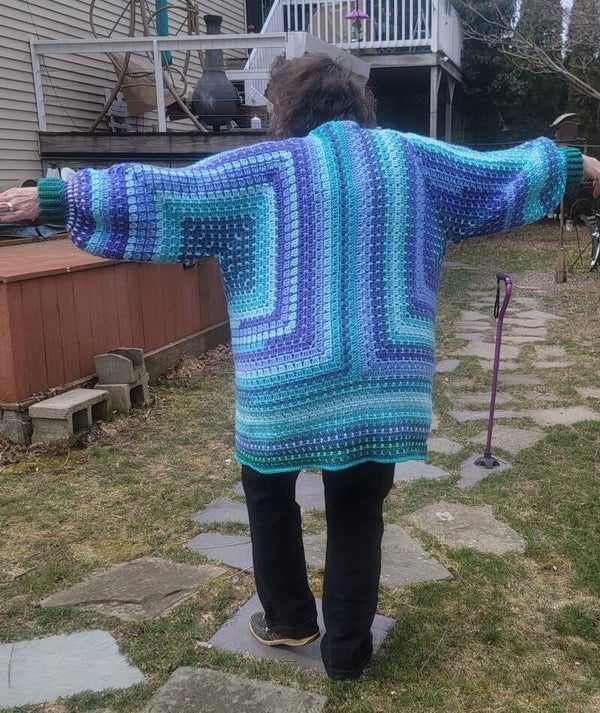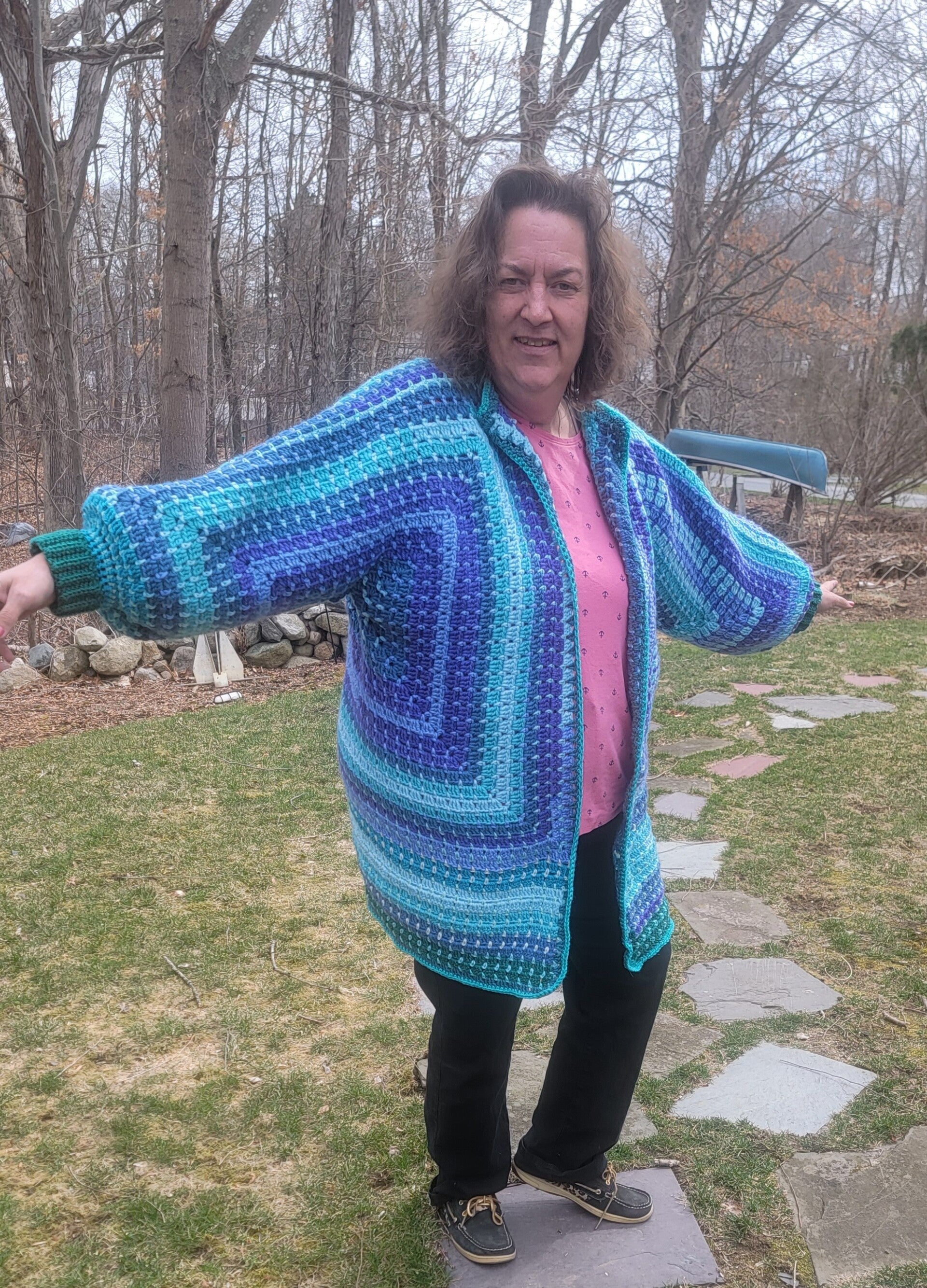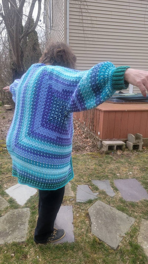 Hexagon long sweater in Incredible shades of Teal, Purple, Aqua modeled by me! Sweater is 35" long. Sleeves are 28" long from shoulder to cuff. Cuff is 10" wide. 54" around from under the armpits