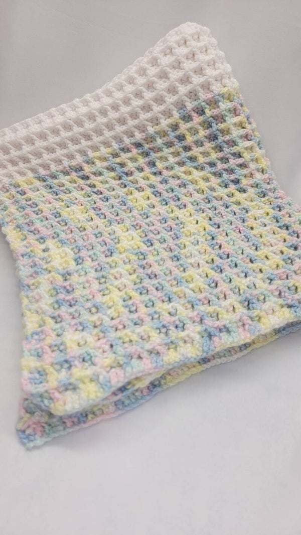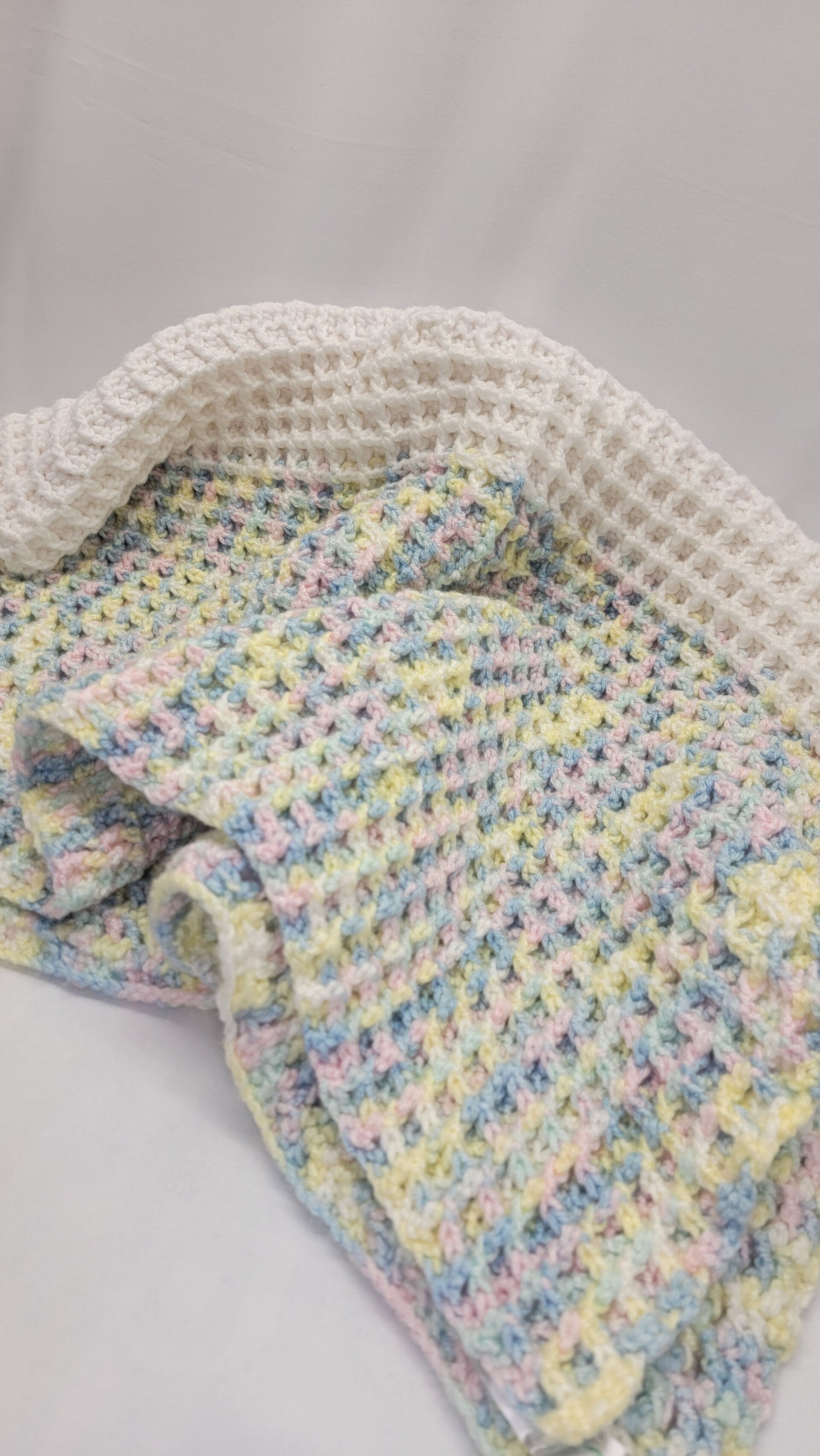 Baby blanket in Pastel colors and Beige in the Waffle stitch. Soft and "cushy"! 37" x 30"