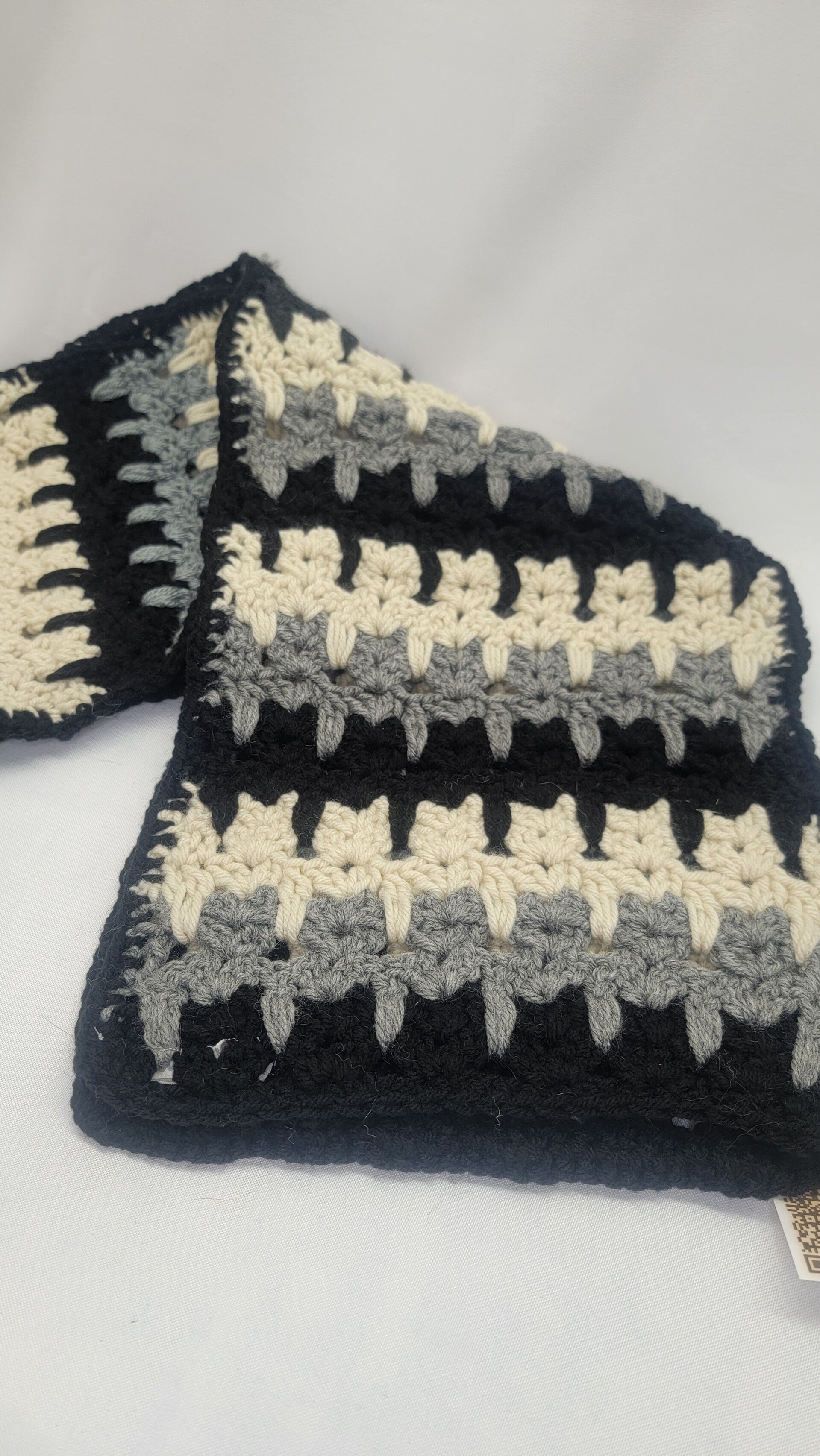 Black, Grey and White scarf in the "Cat" stitch. MEOW! 10" wide and 55" long