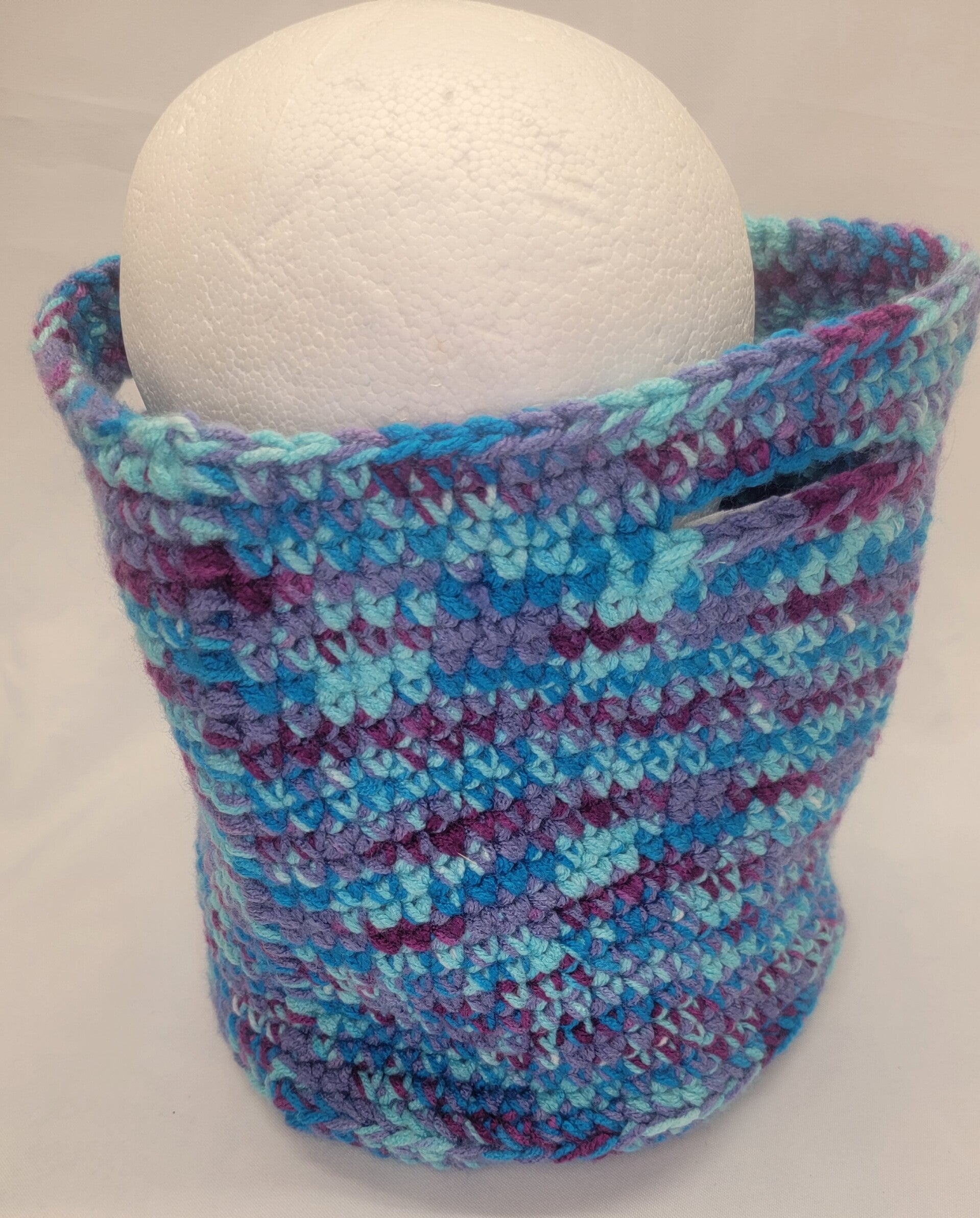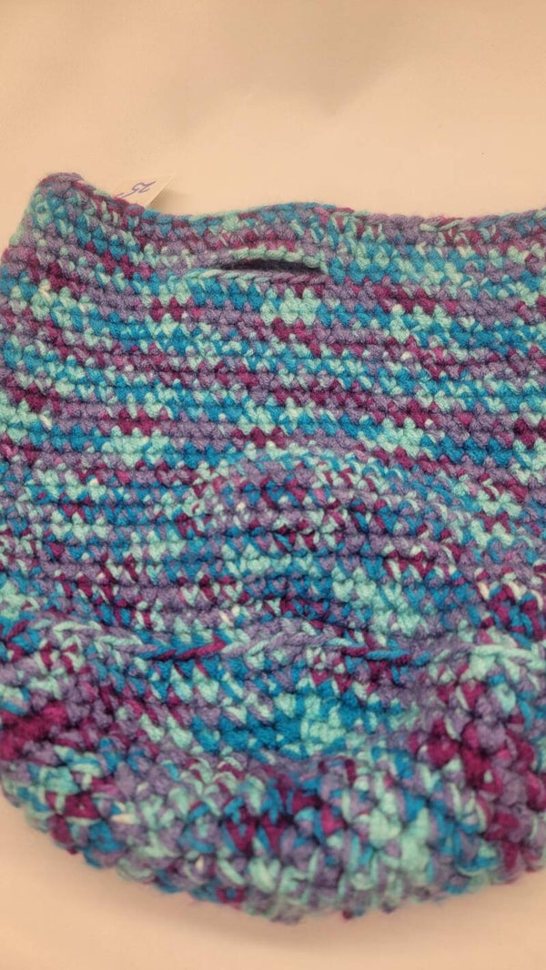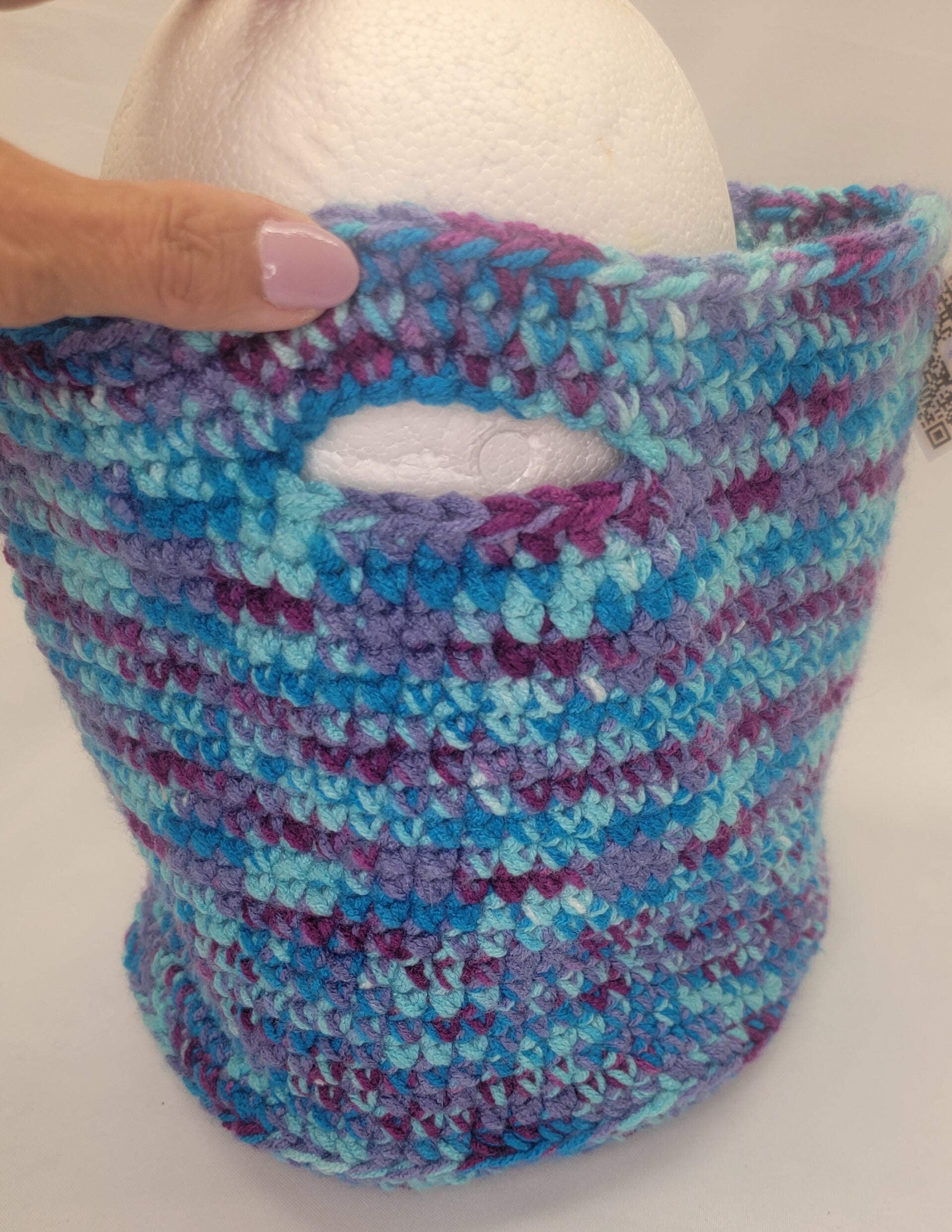 Market bag with built in handles in varigated Turquoise colors. 26" around and 10" high.