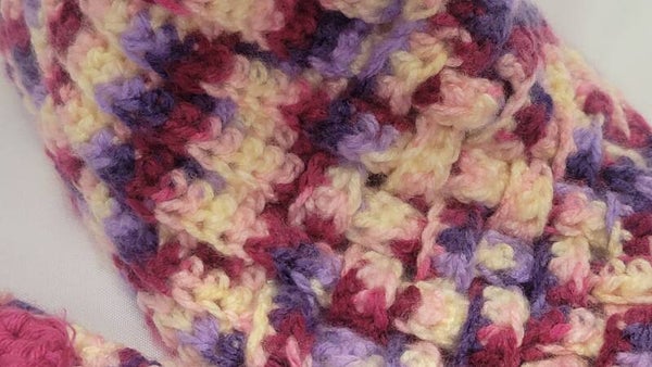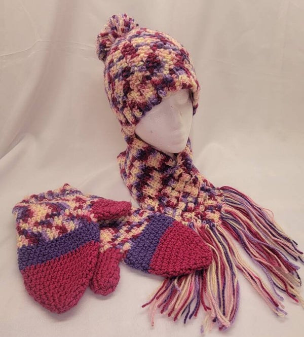 3 piece set including a hat with band and pom pom. Braided cowl with fringe and full mittens. Shades of Purple, Cranberry and Beige. Hat is 20" around band and 8" from center of the hat to band. Gloves are 8" around band and 10.5" from tip of glove to band. Cowl is 17" around and 16" from neck to bottom of the fringe