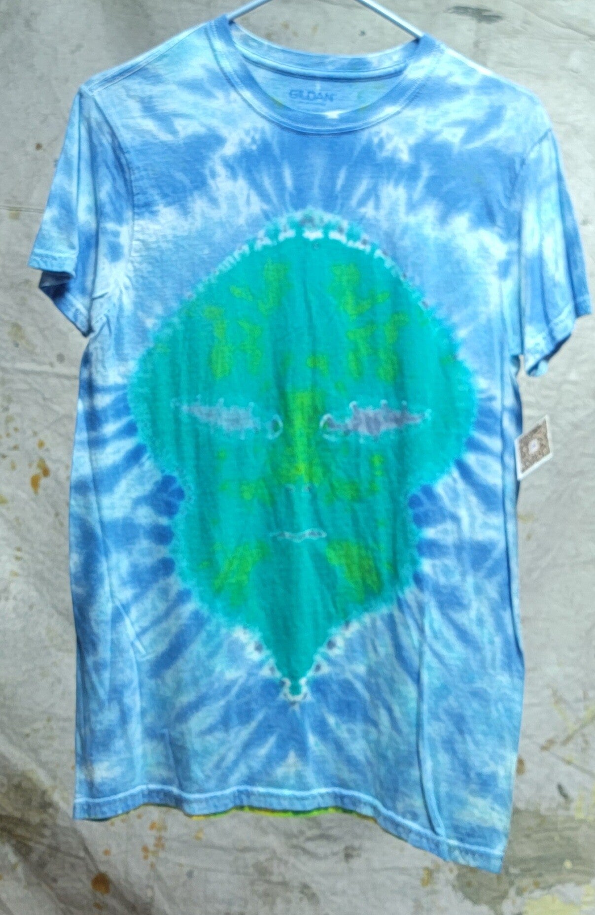 Aluen on front of t-shirt and spaceship on the back. Shades of Blue Green and Yellow