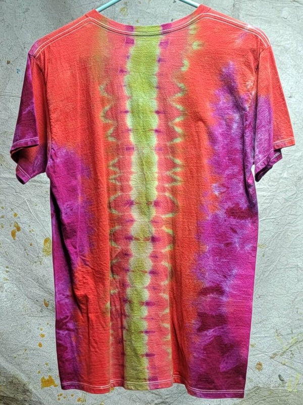 Black guitar with pink and purple background. Spine design on the back