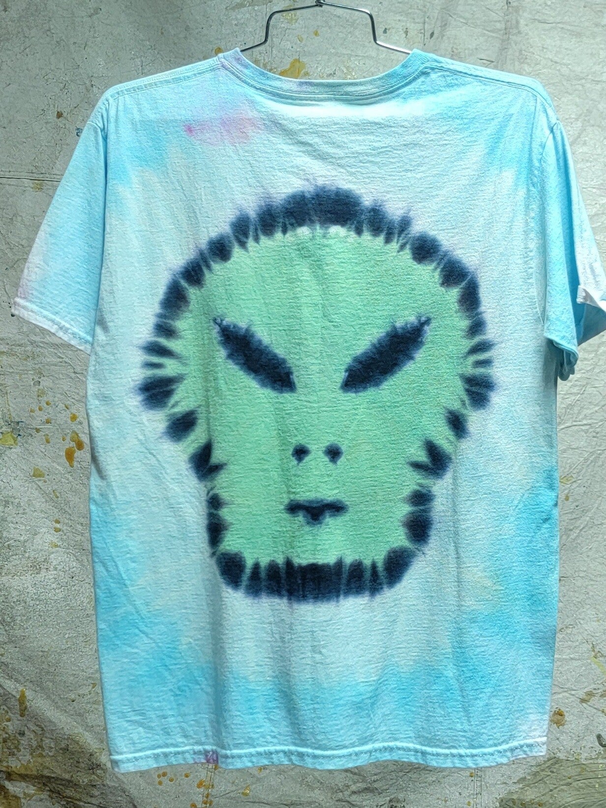 Green alien highlighted in black on a light blue background. Design is on both sides