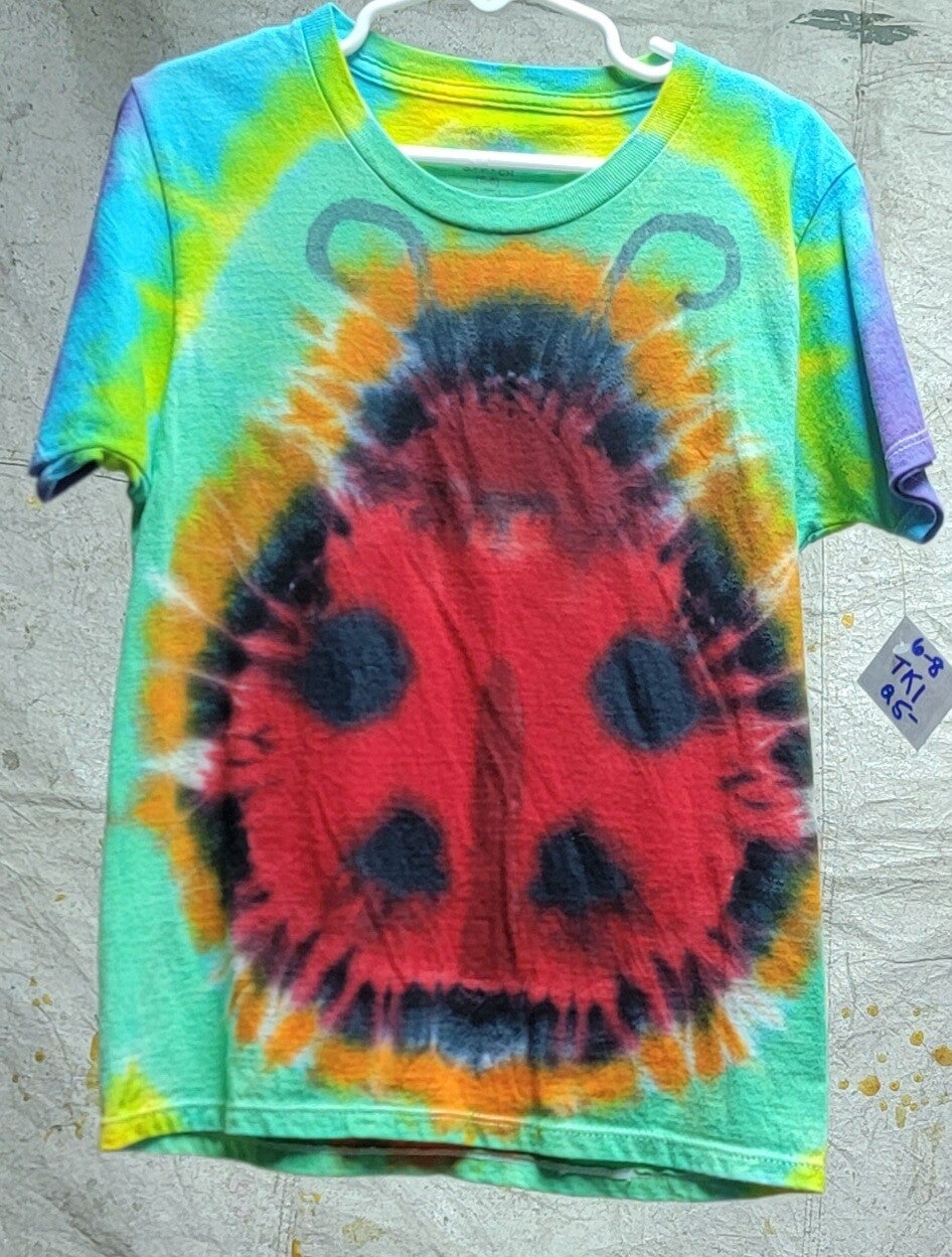 Red ladybug with a green yellow and blue background. Design is on both sides