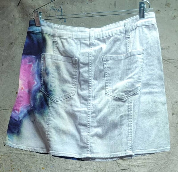 Size 16 SKORT white cotton/spandex. One side of front dyed with shades of blue yellow and pink