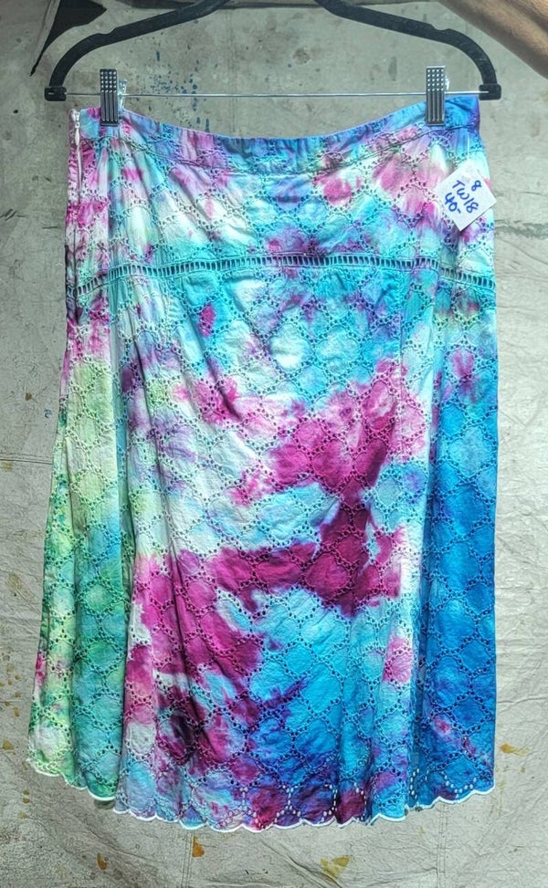 Size 8 eyelet skirt with slip and zipper. Beautiful scalloped edge dyed in shades of blue green and Fushia