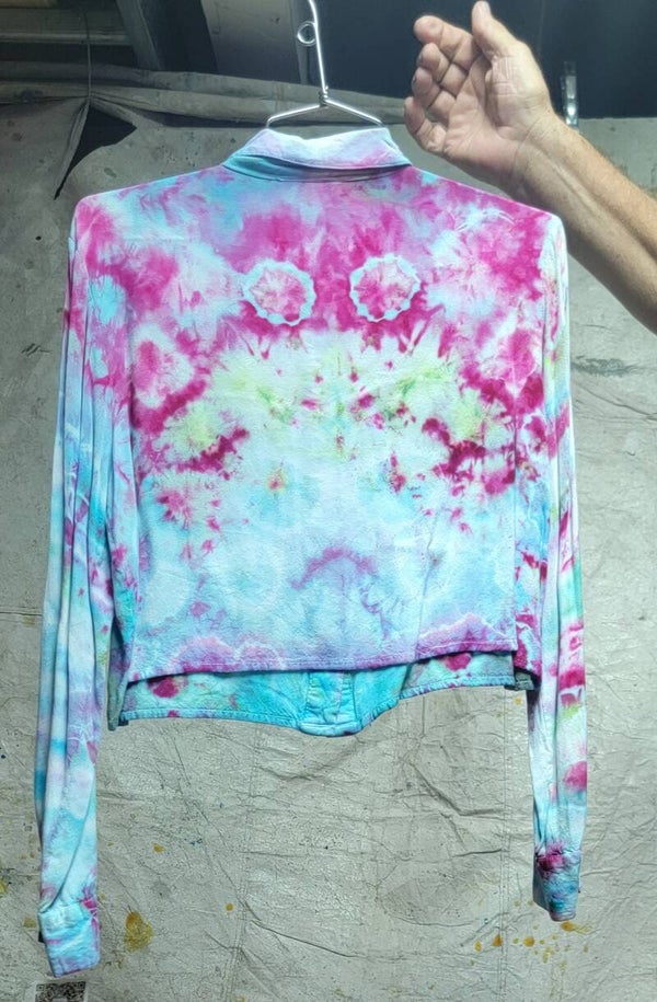 Light Collared short rayon jacket with long cuffed sleeves and 2 front pockets. Dyed in Turquoise Fushia blue and green