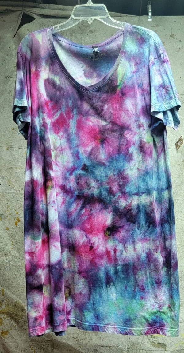 Long cotton v neck t-shirt with short sleeves dyed in hot pink blue and yellow. Dyed to resemble pansies
