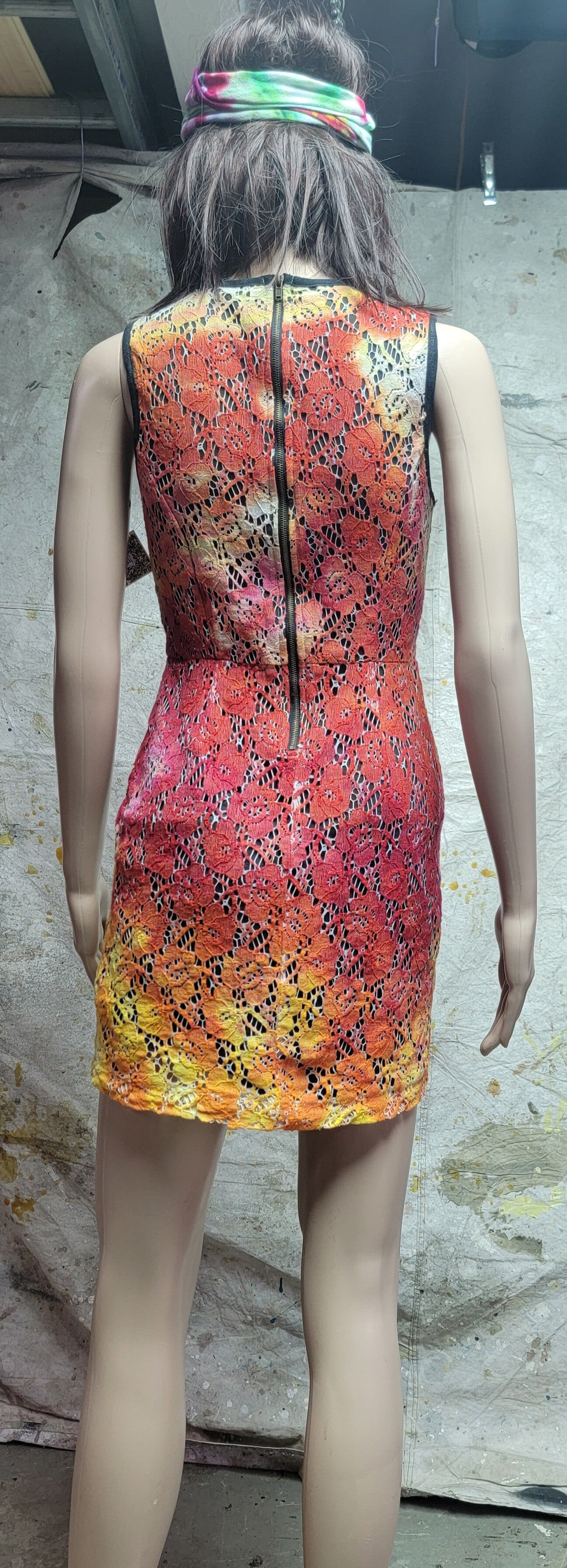 Lace dress with black lining and keyhole on neckline. Black piping on sleeves and neckline. Dyed in FIRE 🔥 colors. Red yellow and orange