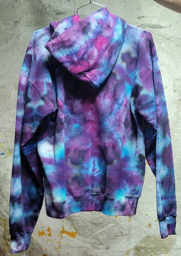 Small hooded pullover sweatshirt with front pouch dyed in shades of Purple and blue