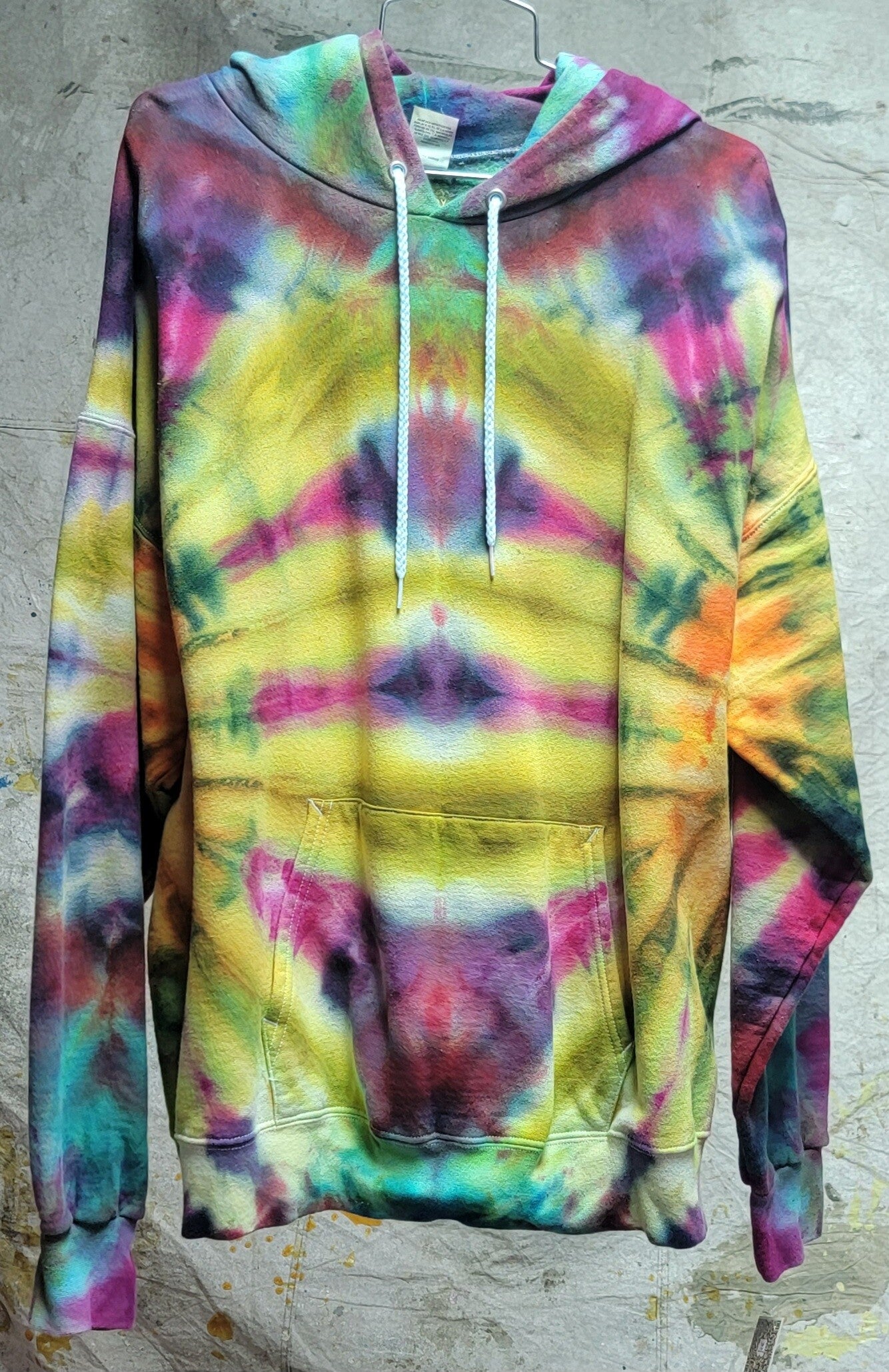 Side fan folded design in yellow orange purple and reds on a hooded long sleeve pullover sweatshirt with a front pocket
