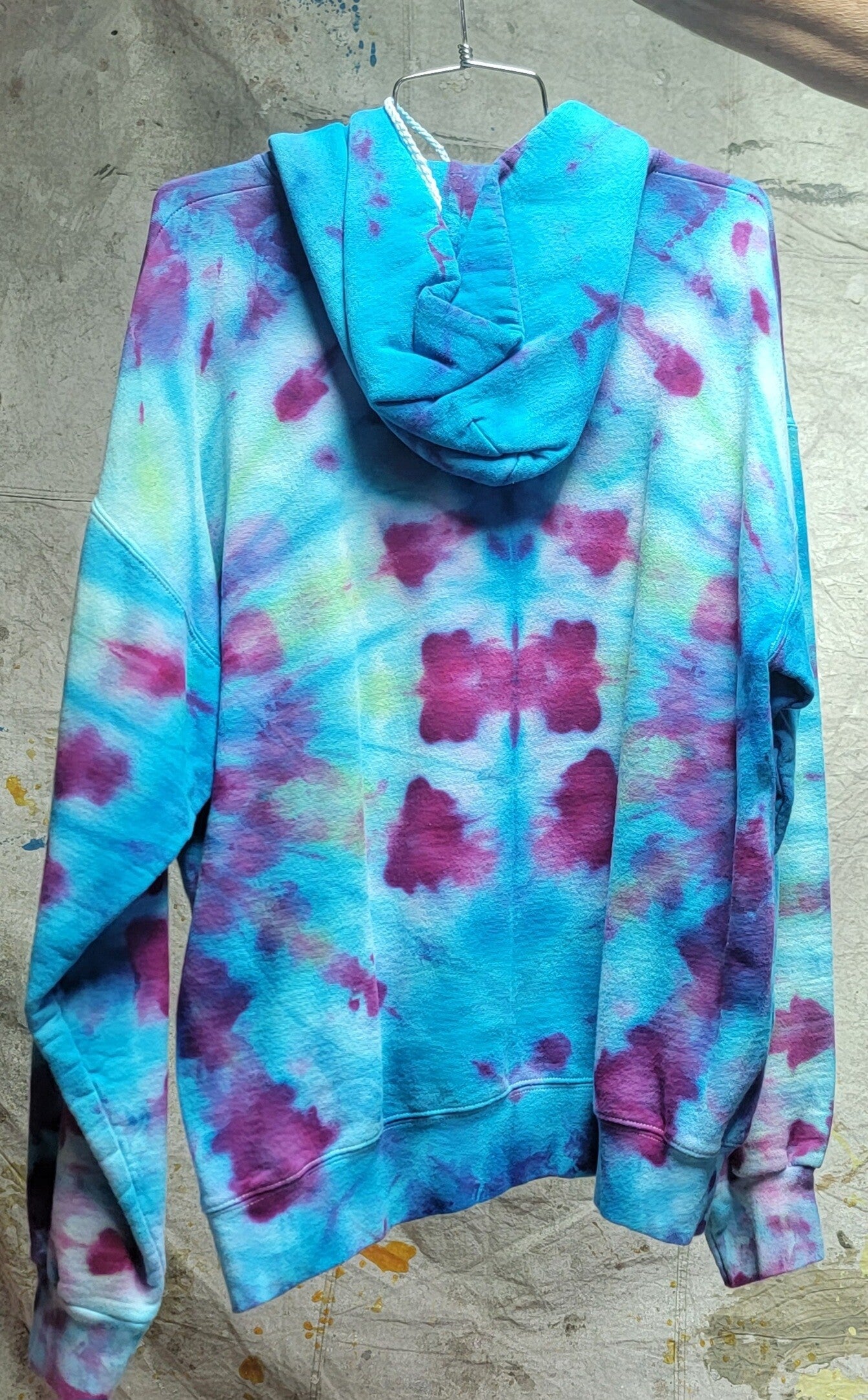 Long sleeved and hooded pullover sweatshirt with front pouch dyed in Turquoise blue and Spearmint