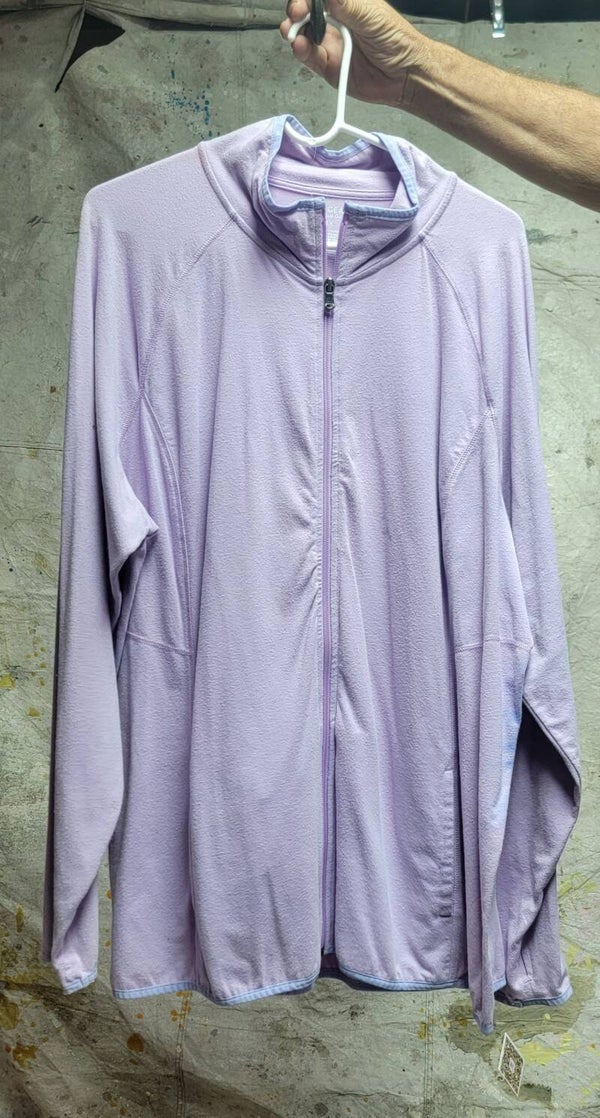 Long sleeved fully zippered lilac sweatshirt with plain front and Mandela dyed on the back. Magenta purple and blue dyes used
