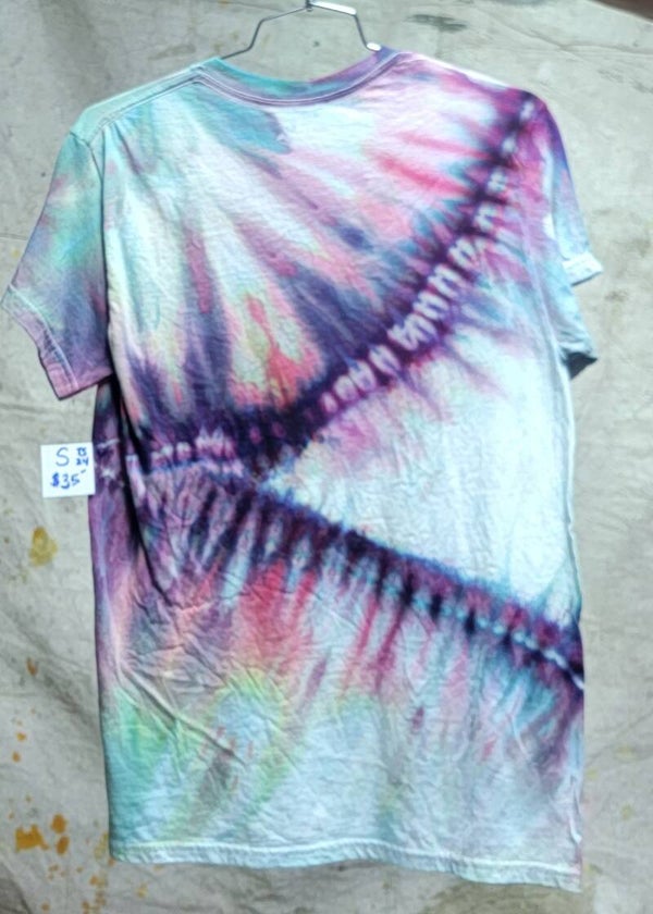White cotton t-shirt with a zipper type effect dyed with Strawberry Skies. Beautiful color splits