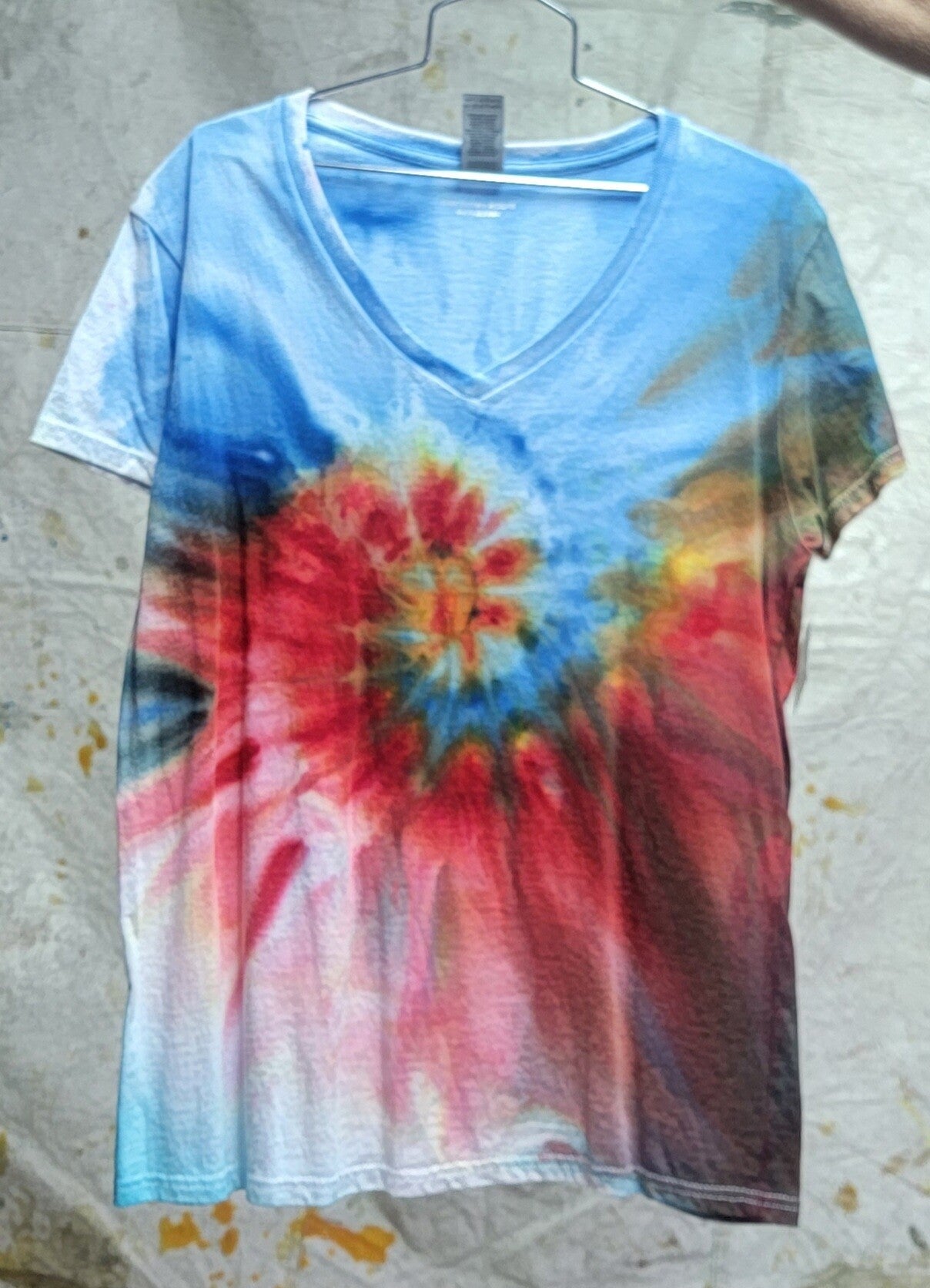 V neck cotton t-shirt with a spiral design on both sides. Red blue and yellow