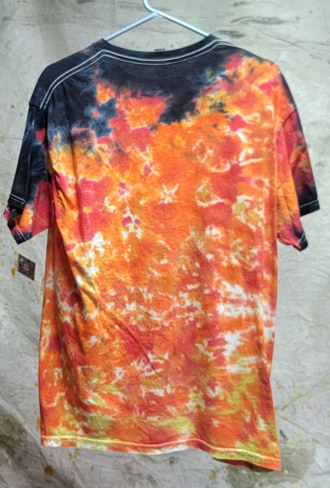 Orange red yellow and black dyed in a scrunch design on a cotton short sleeved shirt