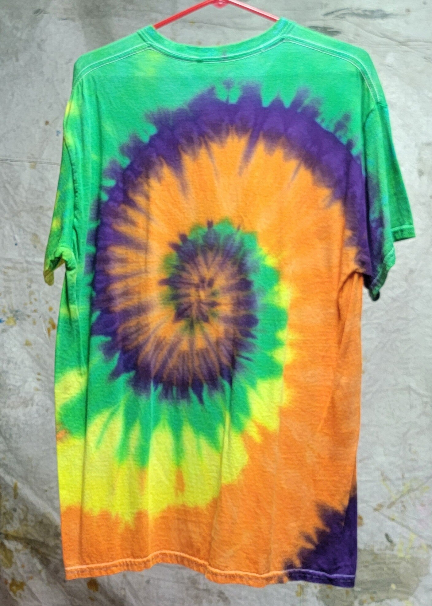 Spiral design in orange purple green and yellow. Design is on both sides. Cotton short sleeved shirt