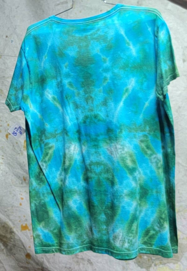 V neck cotton short sleeved t-shirt dyed in shades of turquoise green and blue