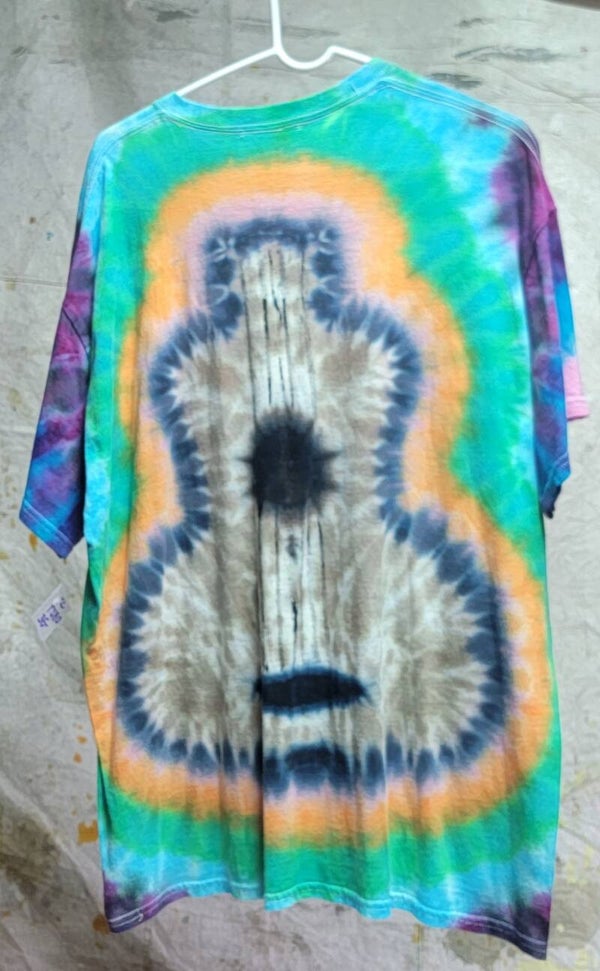 Brown guitar with black outline with a green and yellow background. Design is on both sides. Cotton short sleeved shirt