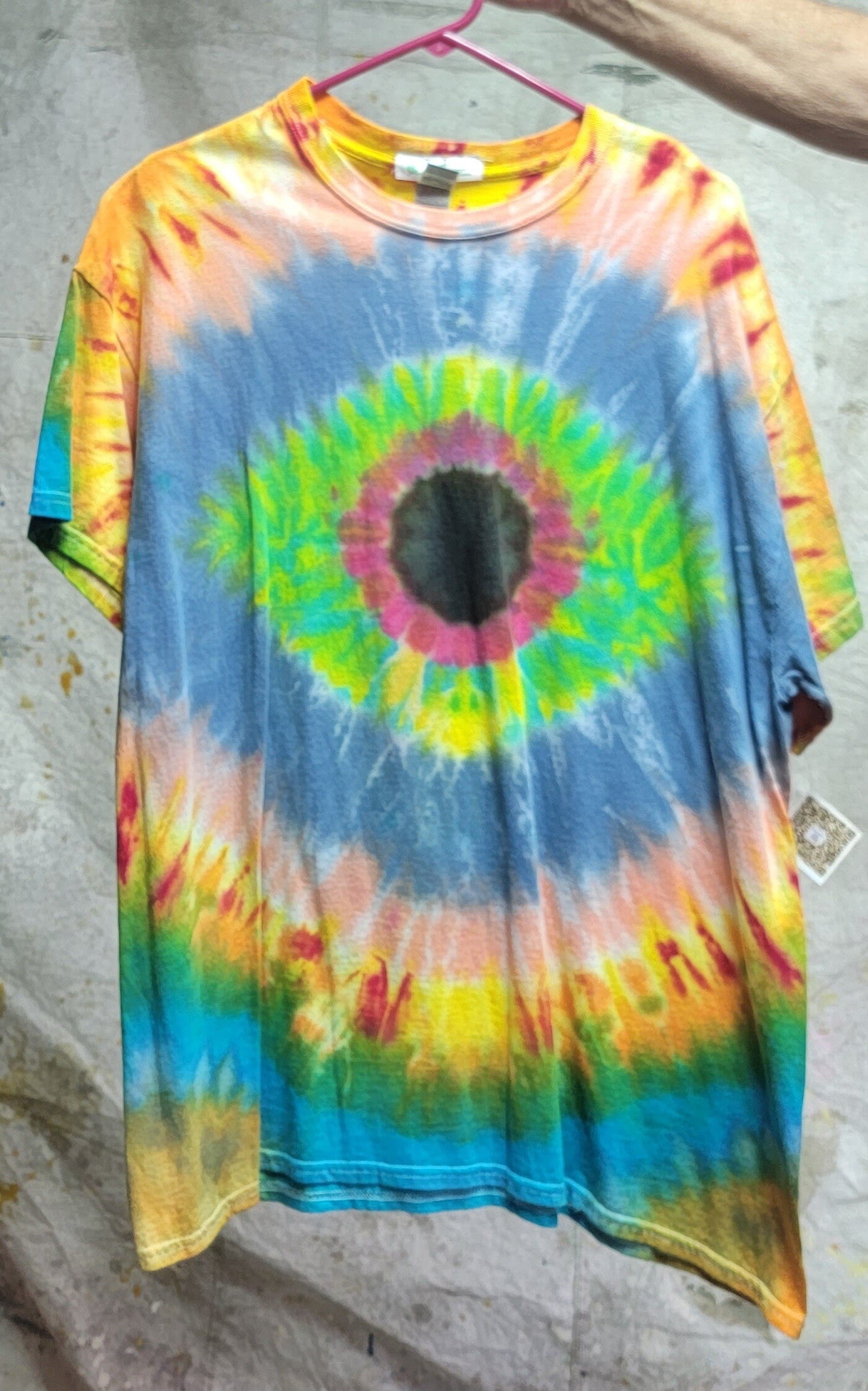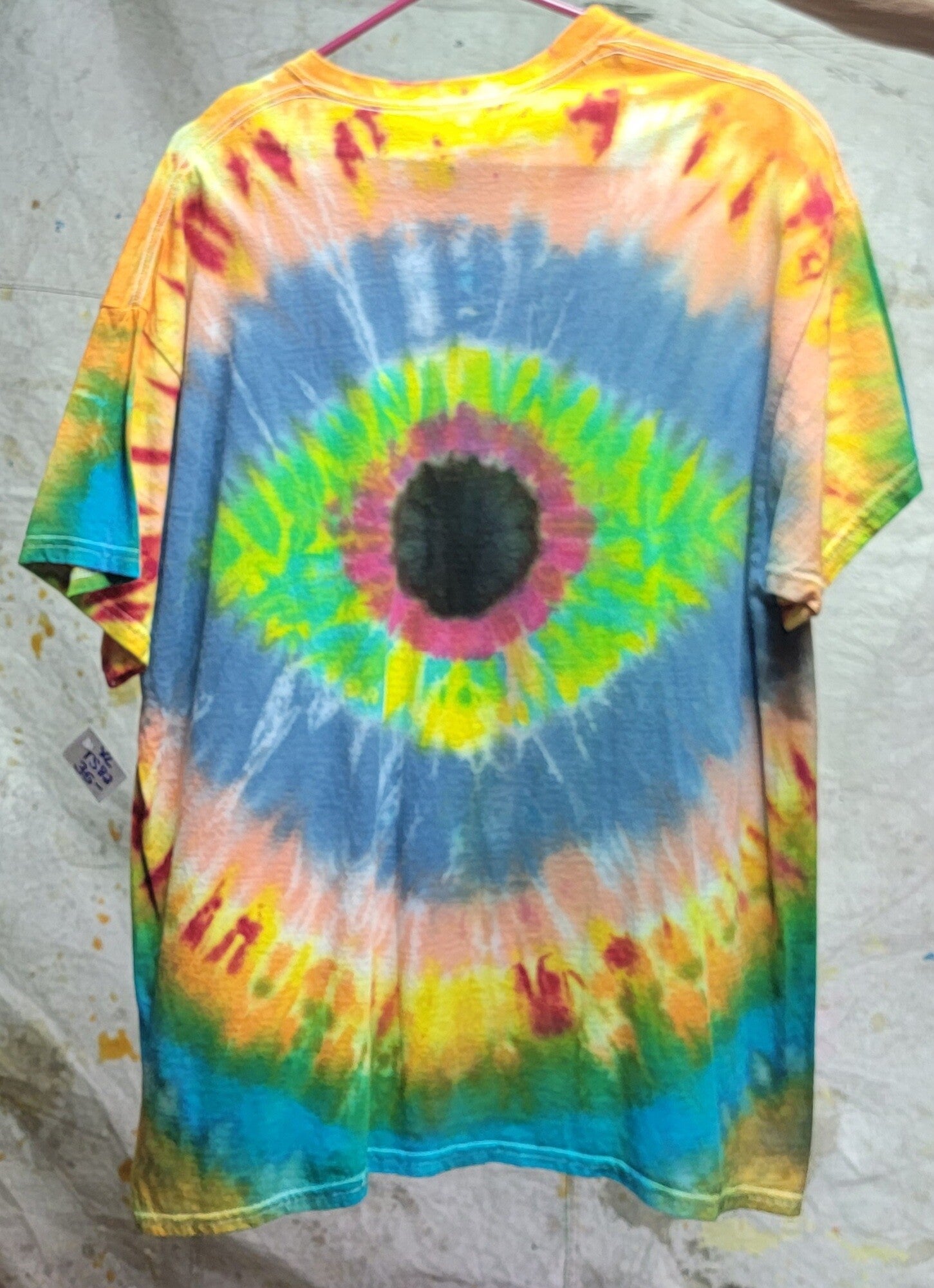 Eyeball design in green yellow and red with a blue pink background. Design is on both sides of a cotton short sleeved shirt