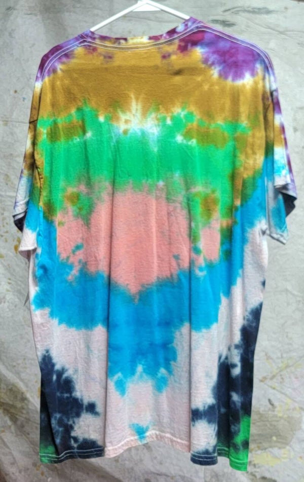 Cat butt design with heart. Background of pubk purple green and blue. Cotton short sleeved shirt