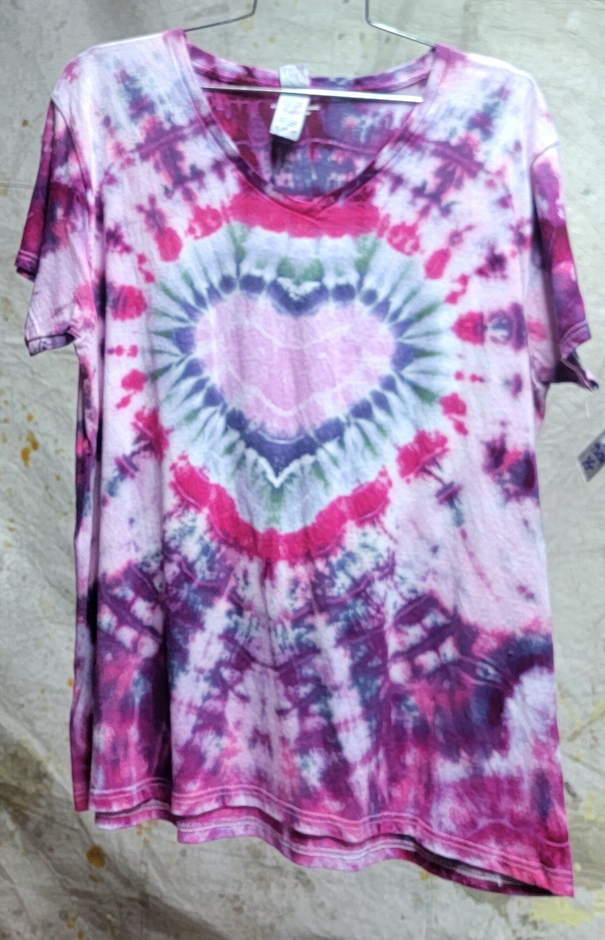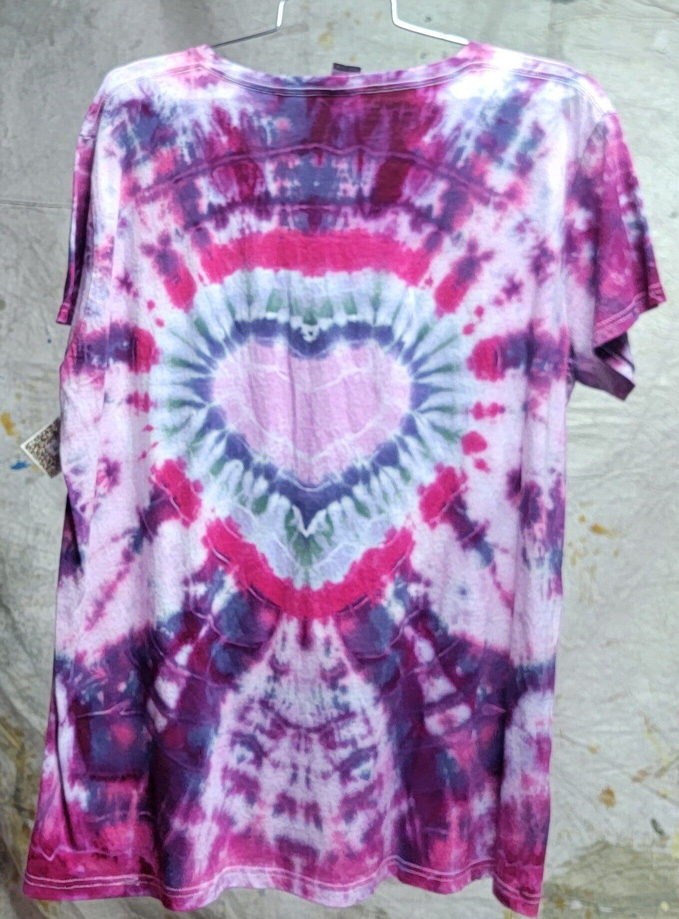 V neck cotton short sleeved shirt with a heart dyed on hot pink grey and raspberry. Design is on both sides