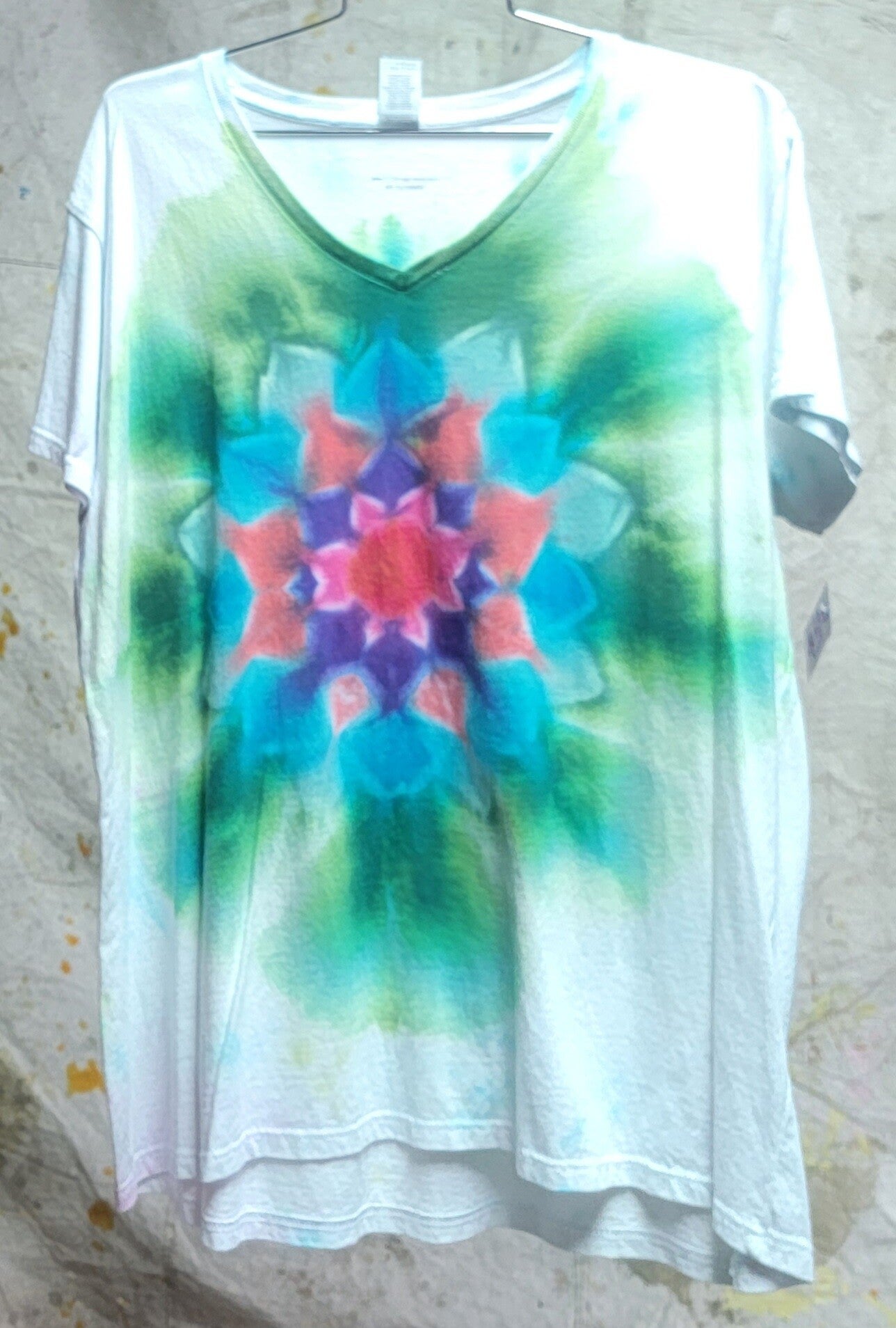 V neck cotton short sleeved t-shirt dyed in shades of blue green purple and red in a Mandela design