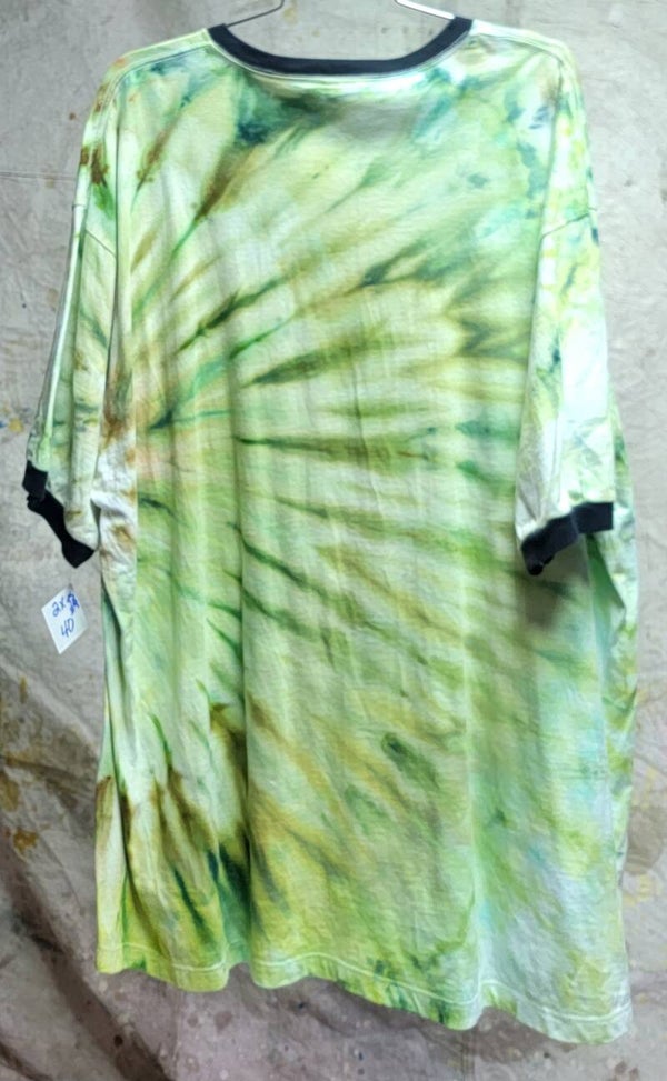 Calvin Klein cotton short sleeved t-shirt trimmed in Navy on the sleeves and neckline. Dyed in shades of green in a side fan folded design