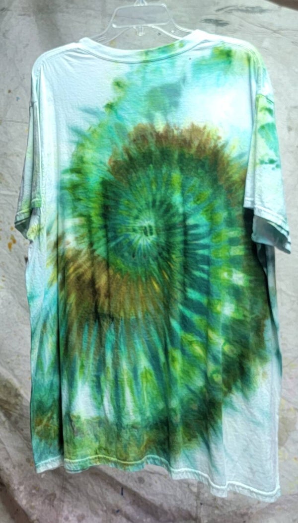 V neck cotton short sleeved t-shirt dyed in the colander method in shades of green.