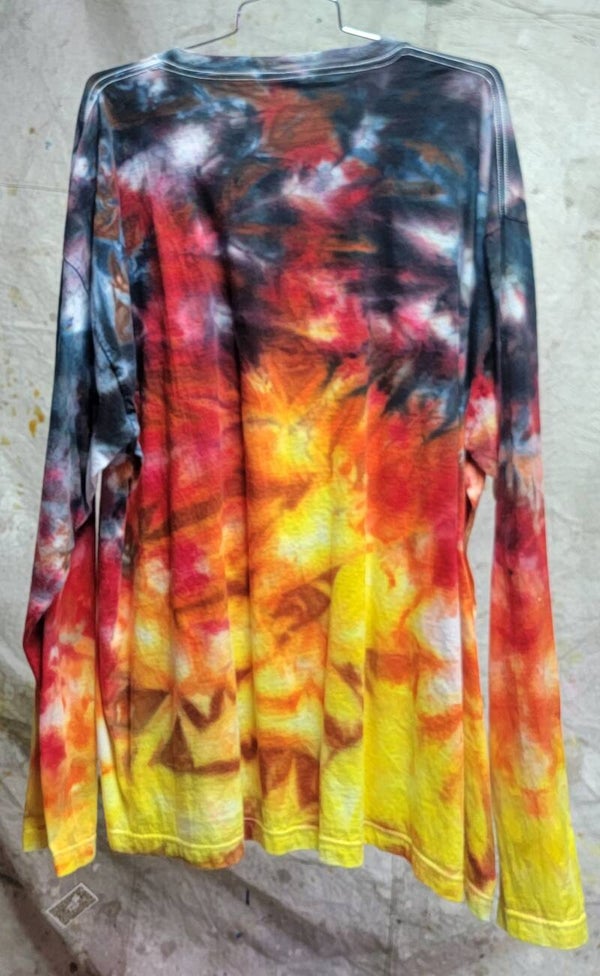 Long sleeved cotton shirt dyed in red orange yellow and black in a scrunched design
