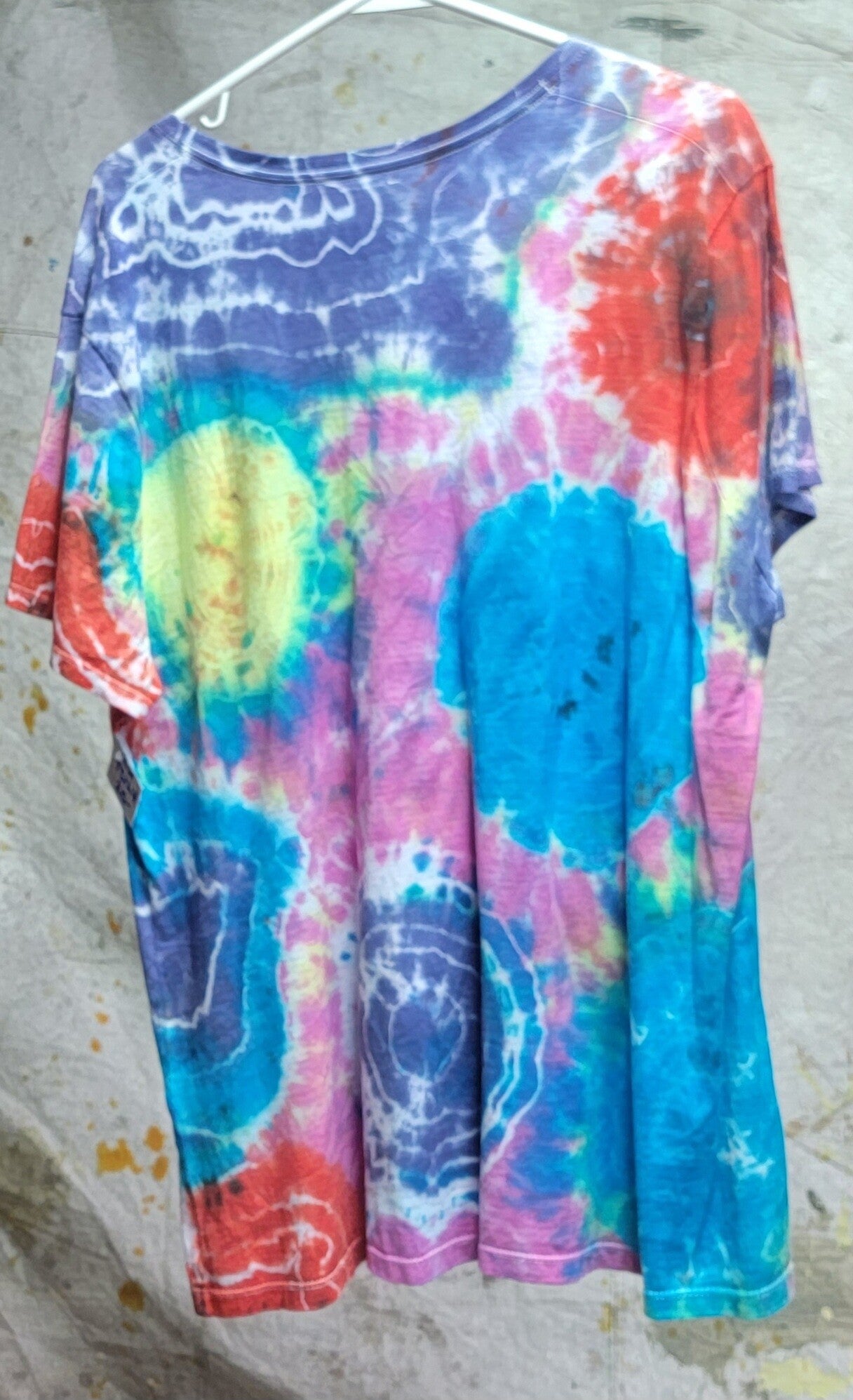 Pink spandex and cotton short sleeved t-shirt dyed in geodes in shades of blue yellow and red