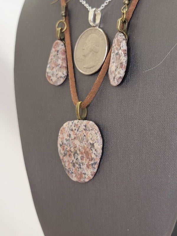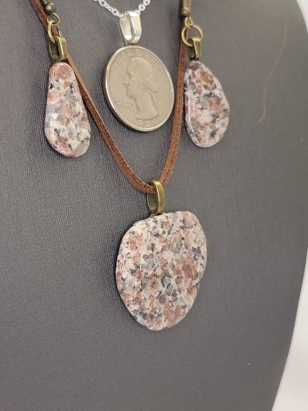 Pendant, Necklace & Earrings, Rhodonite Crystal, Cabochon.