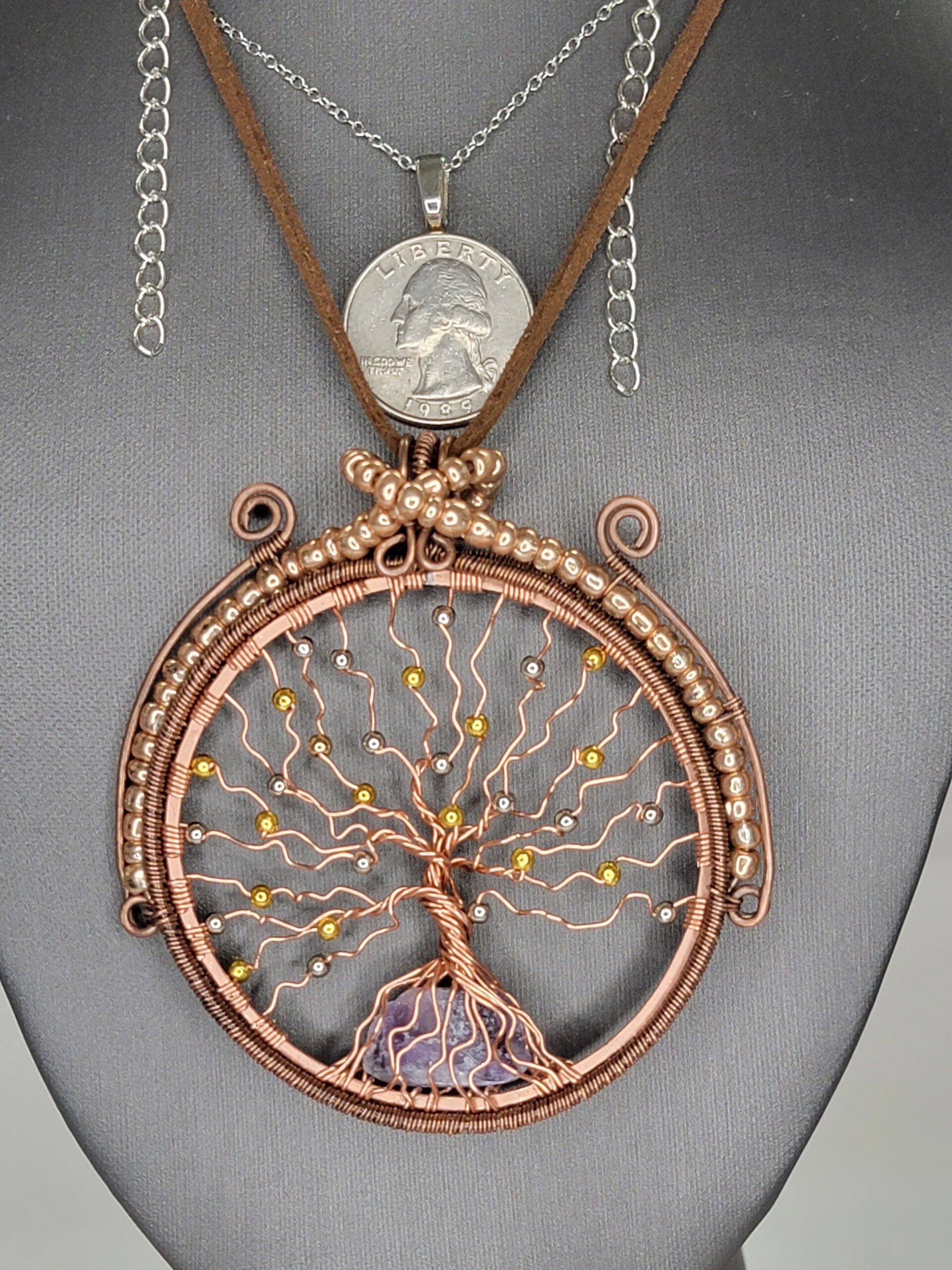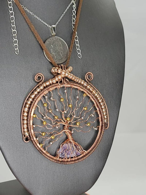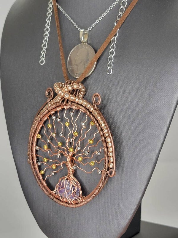 Pendant & Necklace, Suncatcher, Rainbow Fluorite Crystal Cabochon, Tree of Life, w/Circle of life, Wire wrapped