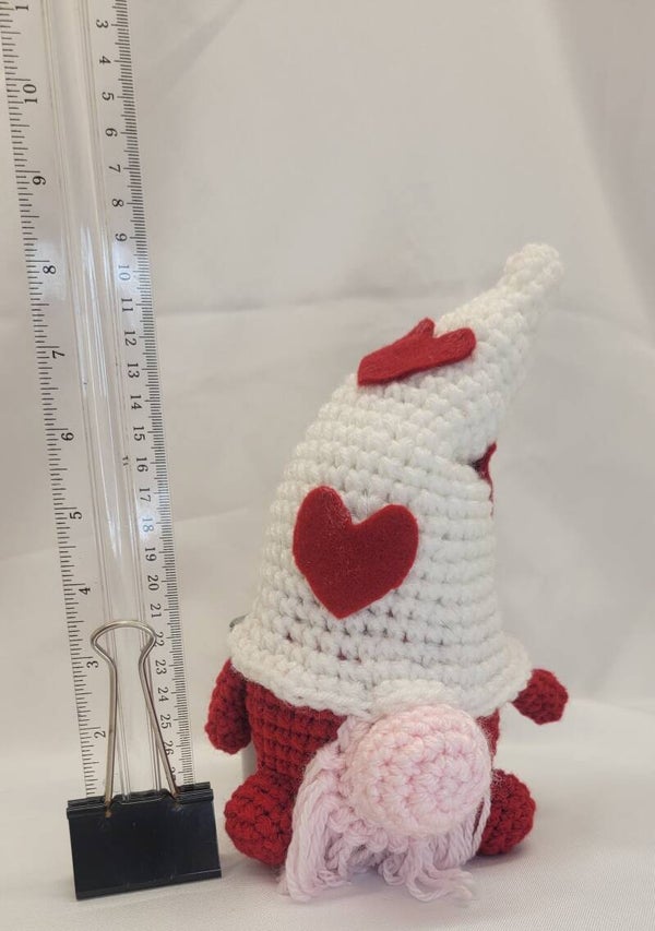 9" tall Valentine's Gnome with red felt hearts on his white hat and pink nose/beard