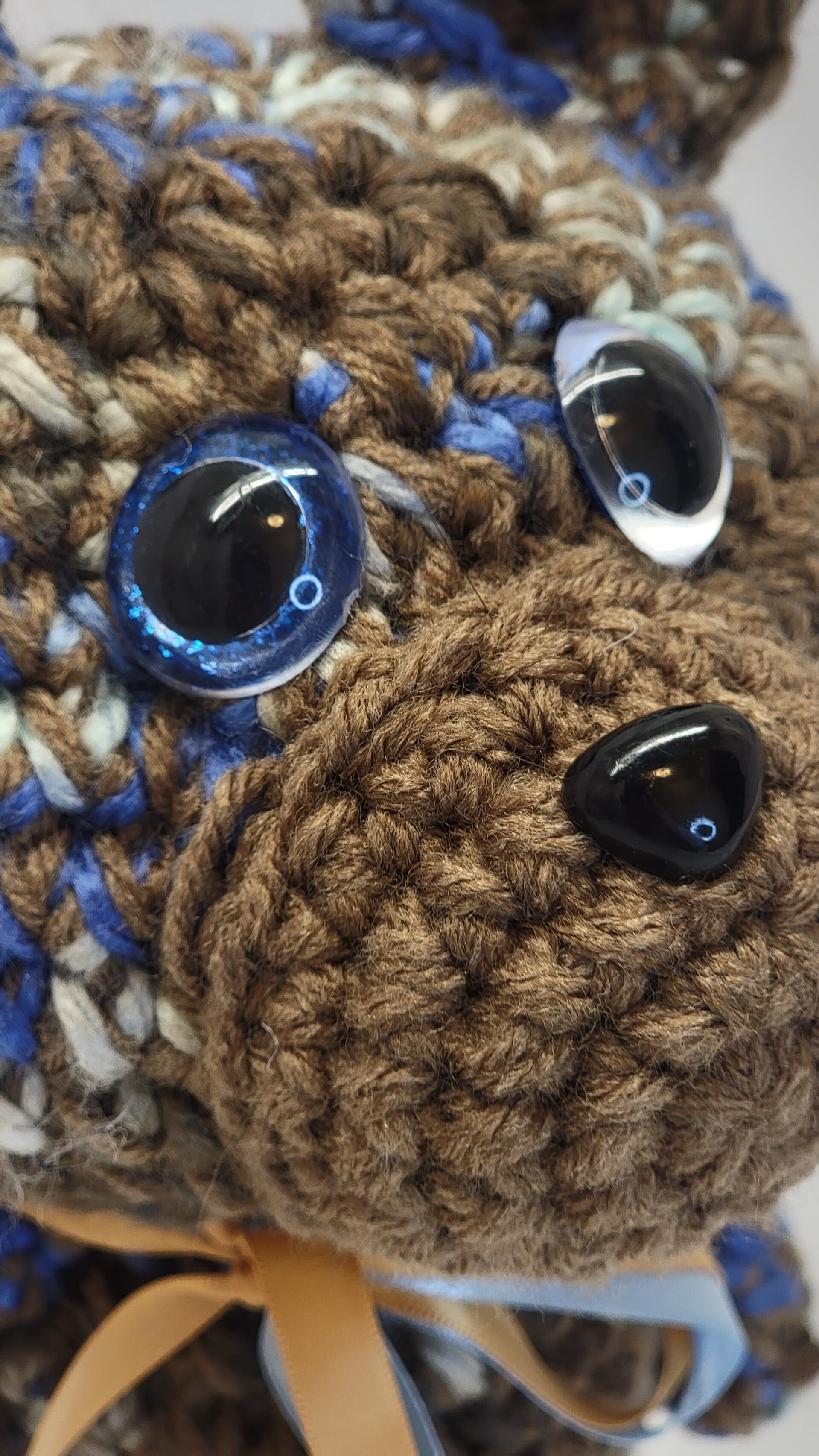 12" tall Brown/Tan and Blue Teddy Bear. Blue sparkly safety eyes and nose. Gold and blue ribbon around his neck.
