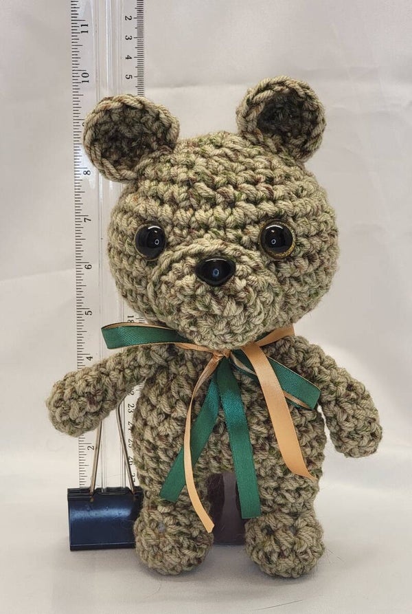 10.5" tall Teddy Bear in Green/Tan colors. Gold sparkly safety eyes and nose. Green and gold ribbons
