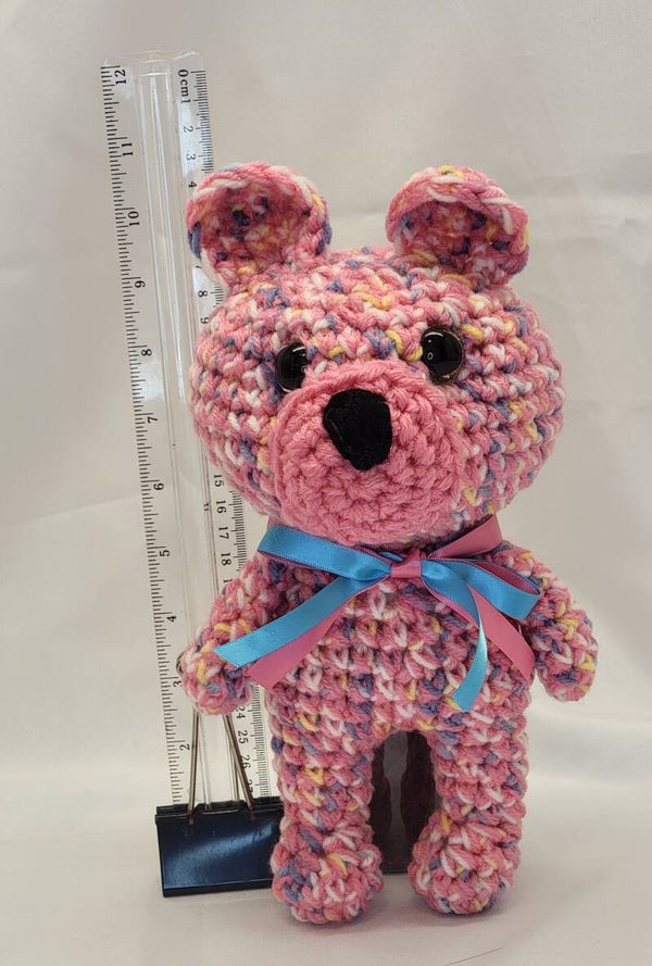 11.5" tall Teddy Bear in pink, white, yellow and blue. Gold sparkly safety eyes and sewn on nose. Pink and blue ribbons