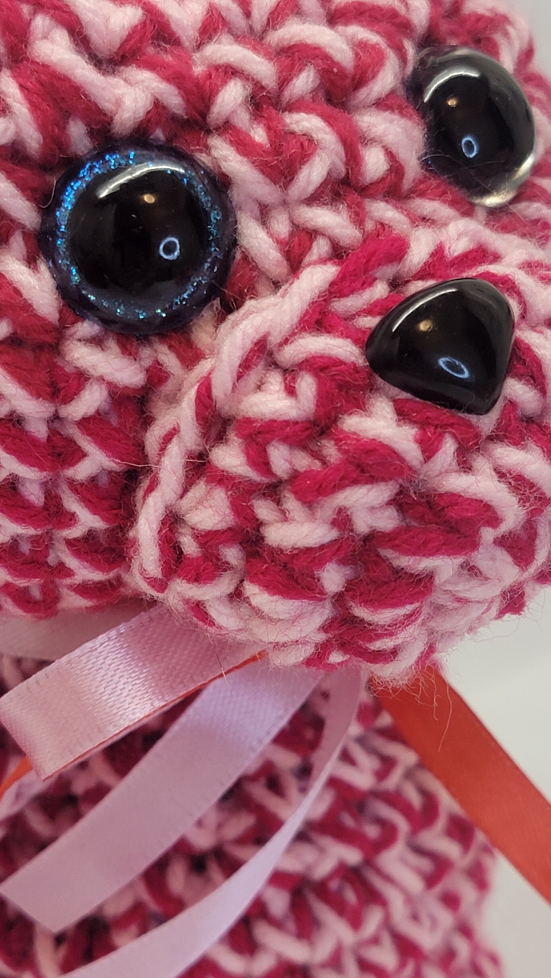 11.5" tall Teddy Bear in Red and Pink. Blue sparkly safety eyes and nose. Pink and Red satin ribbons