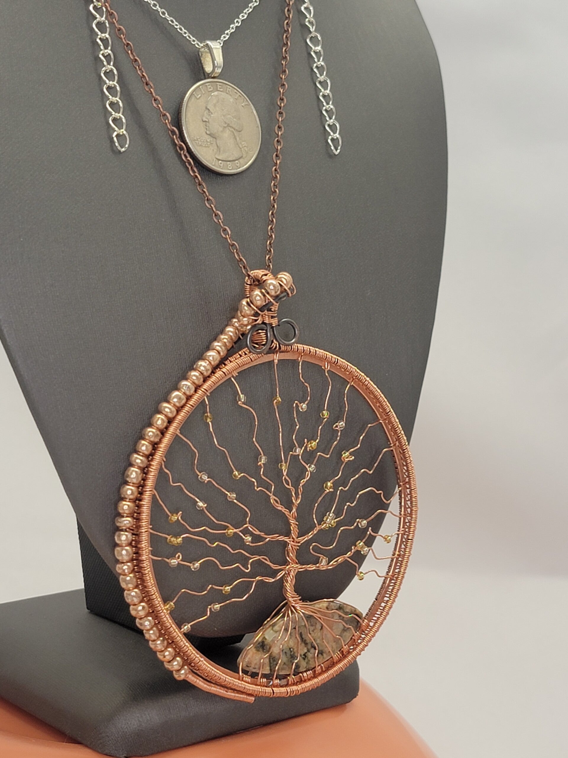 Pendant & Necklace, Suncatcher, Rainbow Fluorite Crystal Cabochon, Tree of Life, w/Circle of life, Wire wrapped
