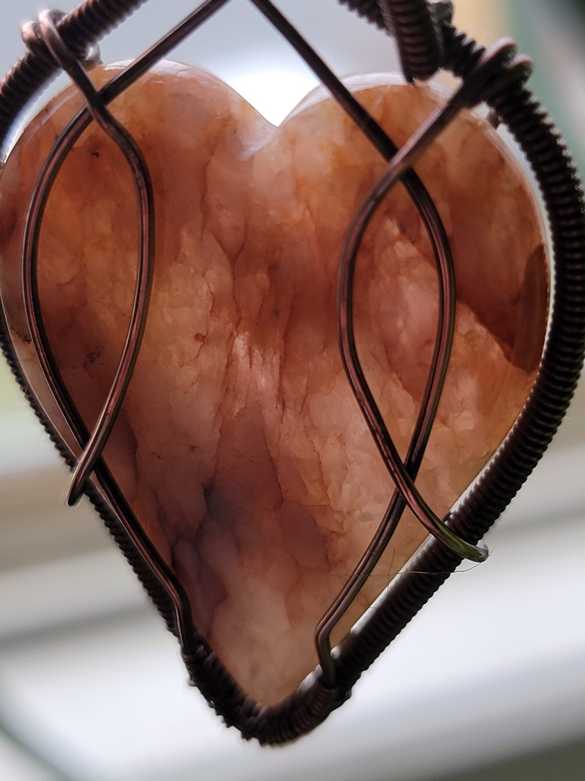 Pendant & Necklace, Sunstone Cabochon Heart, Wire Wrapped