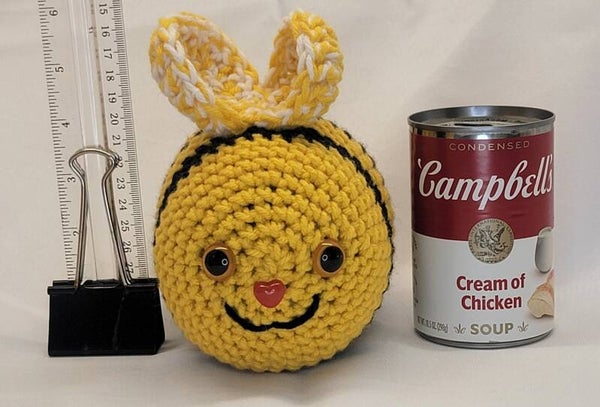 Yellow and Black Bee with Yellow and white wings. Yellow safety eyes and a red heart nose