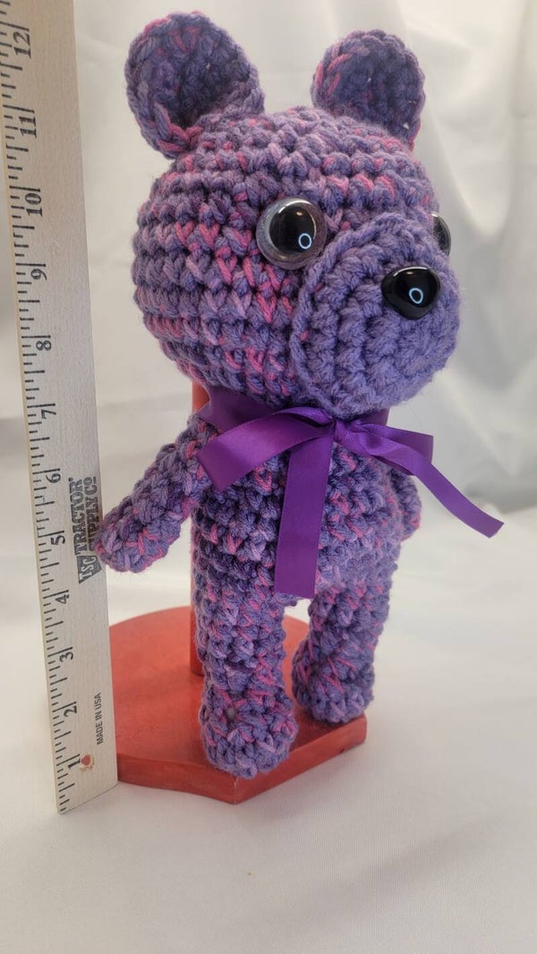 13" tall Teddy Bear in Hot Pink and Purple yarn. Purple ribbon around his neck and pink sparkly safety eyes